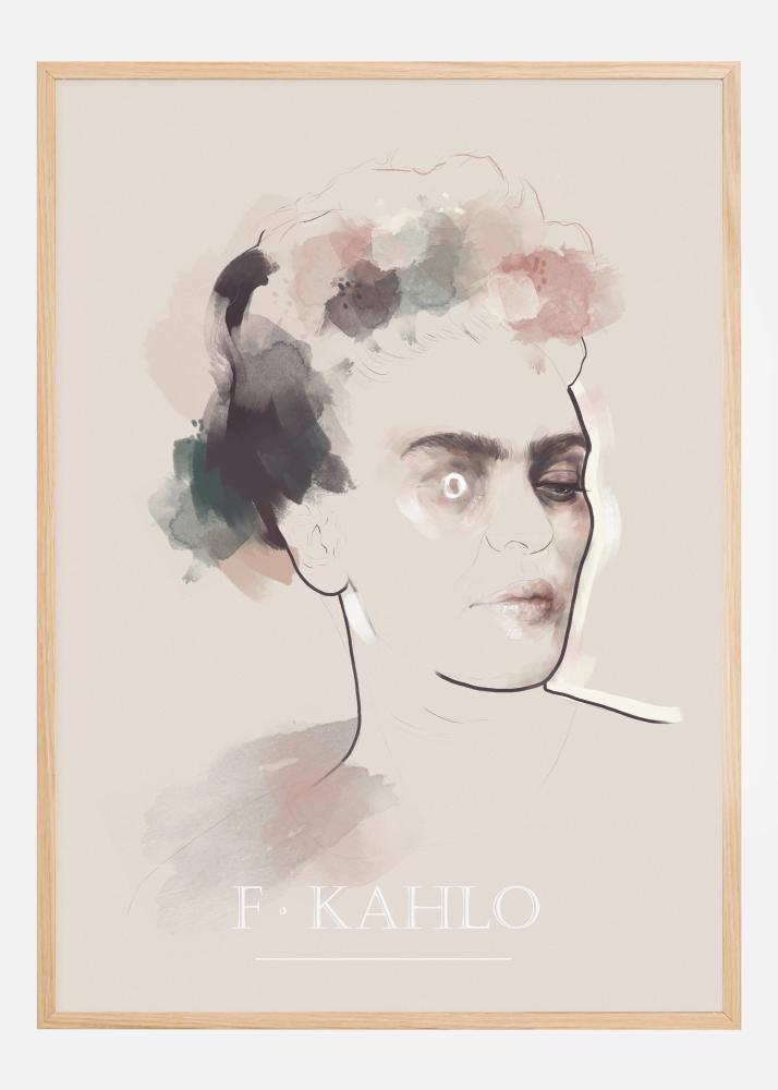 En abstrakt porträtt-poster med Frida Kahlo med blommor i håret. En enkelt ritad skiss av Frida fångar omedelbart hennes essens, eftersom hon djärvt stirrar ut ur målningen. De enda fläckarna av färg är hennes läppar och huvudbonaden av blommor i hennes hår. Matcha dessa färger på väggen där du hänger henne.