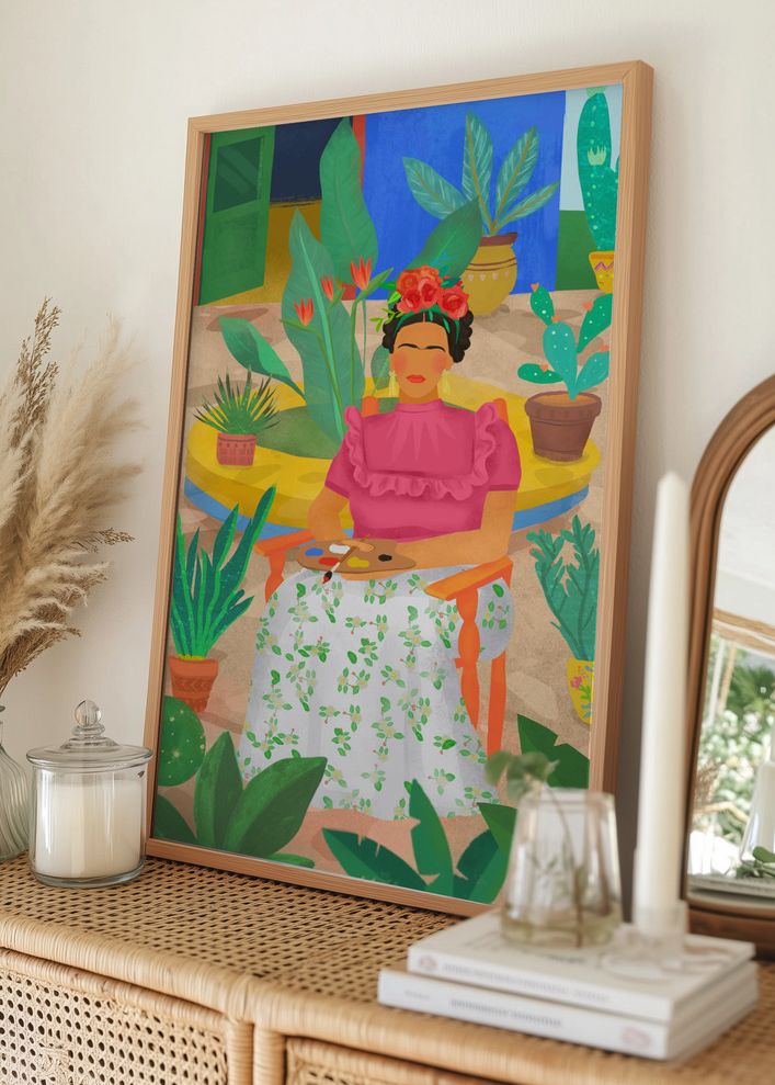 Denna färgstarka affisch fångar uppmärksamheten med sin levande palett och konstnärliga motiv. I centrum ser vi en stilren illustration av en person klädd i en rosa blus med volanger och en lång, blommig kjol. De tropiska växterna, inklusive kaktusar och palmblad, skapar en frodig och levande omgivning som omger huvudpersonen. Den blå väggen och den gula bänken i bakgrunden adderar ytterligare lager av färg och djup till denna trendiga poster.