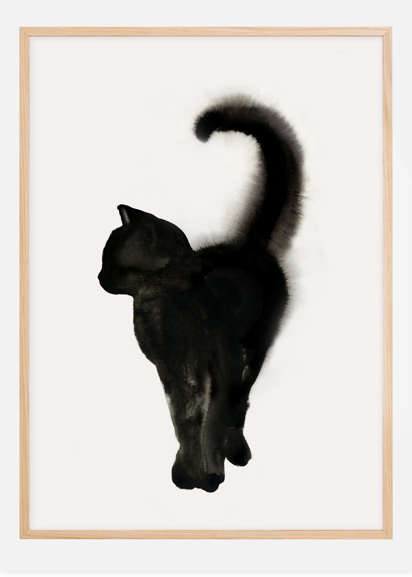 En djur-poster med en svart kattunge som poserar mot en vit bakgrund. Den svarta katten står med tassarna ihop och tittar till vänster med svansen i en frågande böj. En blandning av hårda konturer och mjuka penseldrag ger denna enkla bild struktur och gör den mer intressant, perfekt för vilken vägg som helst.