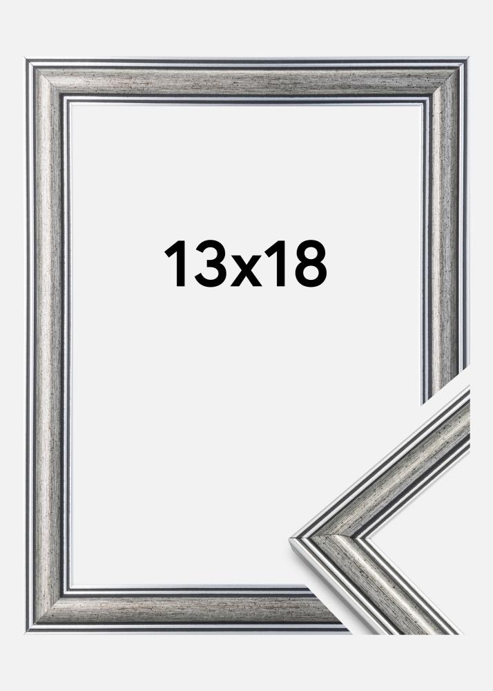 Frigg är en silverram med svarta linjer och svartspräckliga inslag. Passar utmärkt när du söker en bred traditionell silverram som passar till många typer av bilder och miljöer.