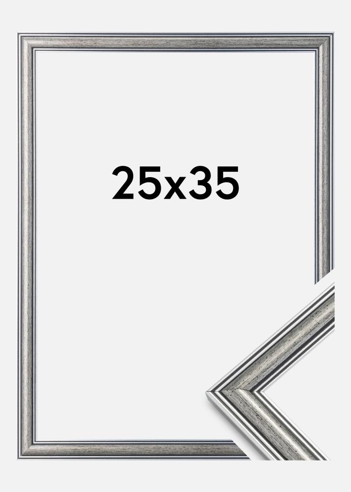 Frigg är en silverram med svarta linjer och svartspräckliga inslag. Passar utmärkt när du söker en bred traditionell silverram som passar till många typer av bilder och miljöer.