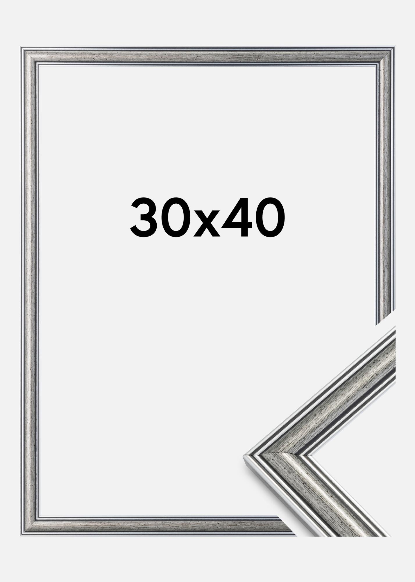 Frigg är en silverram med svarta linjer och svartspräckliga inslag. Passar utmärkt när du söker en bred traditionell silverram som passar till många typer av bilder och miljöer.