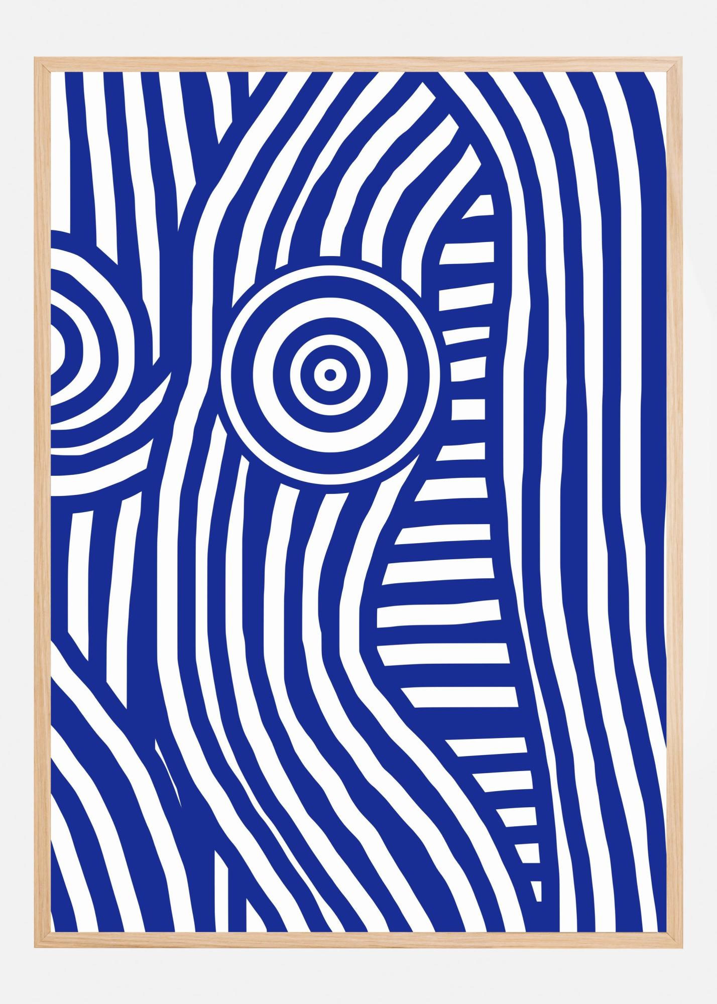 Denna moderna och iögonfallande poster föreställer ett abstrakt konstverk som kännetecknas av dess dynamiska och vågiga linjer som skapar hypnotiska mönster och former. Den djärva användningen av kontrasterande färger - huvudsakligen blått mot en ren vit bakgrund - ger motivet ett starkt visuellt intryck. De linjära elementen på affischen bildar ett nästan organiskt formspråk som kan likna naturfenomen eller en unik tolkning av rytmer i musik eller rörelse.