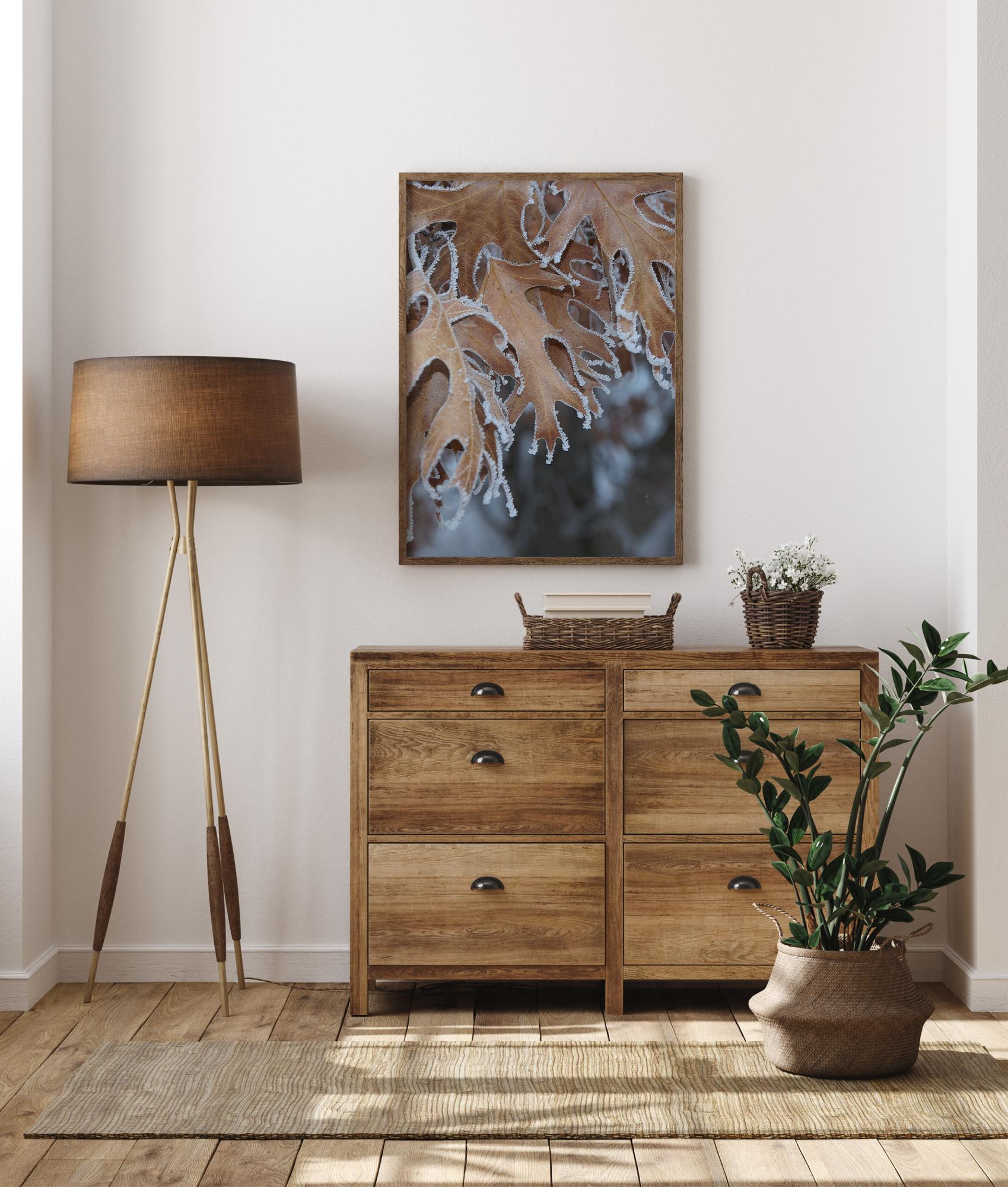 En makro-poster med höstlöv, kantade med frost. De bruna och torra löven rullar ihop sig i kylan, var och en med en frostkant av små ispartiklar som skapar en sorts dekoration. Känn iskylan när du hänger upp den här.