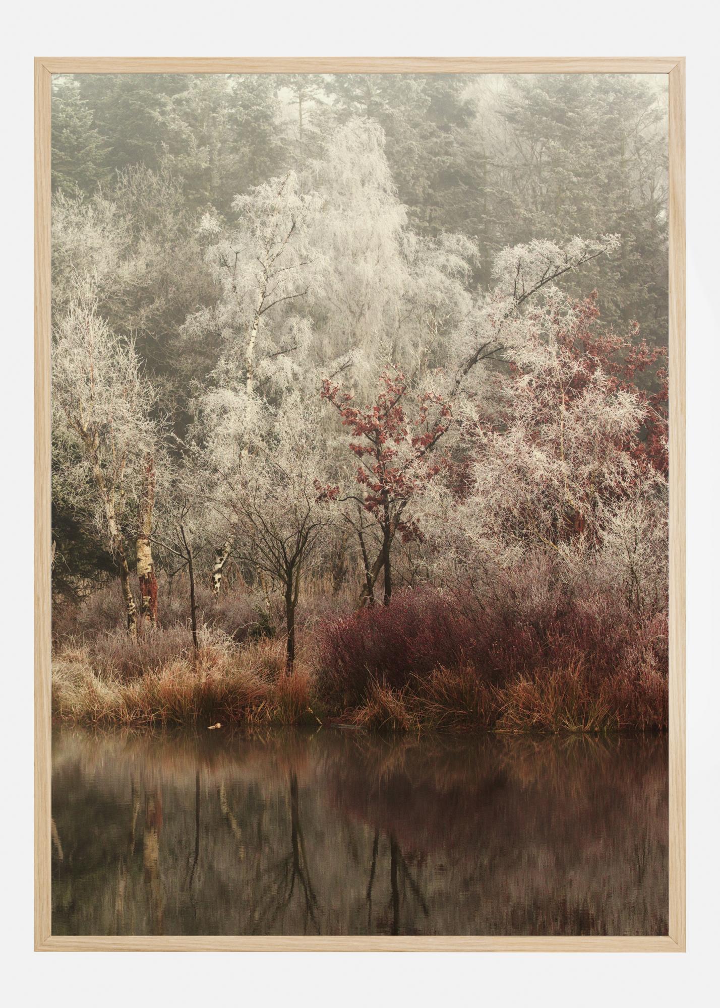 En tyst och stilla poster med ett fruset skogslandskap. En klar och stilla sjö finns i förgrunden med mörkt rött gräs och frostäckta träd i bakgrunden. Du kan nästan känna stillheten och lugnet som utstrålas från denna vackra, magiska bild.