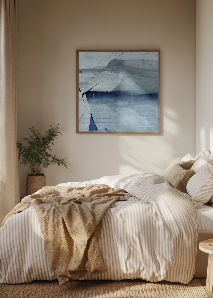 Färgpaletten i denna print domineras av djupa, kalla blå nyanser, kompletterade av ljusblå och vita inslag som balanserar kompositionen. Dessa färger gör affischen lätt att matcha med både neutrala och ljusa inredningar. Denna affisch är idealisk för dem som söker en harmonisk och modern inredningsdetalj.