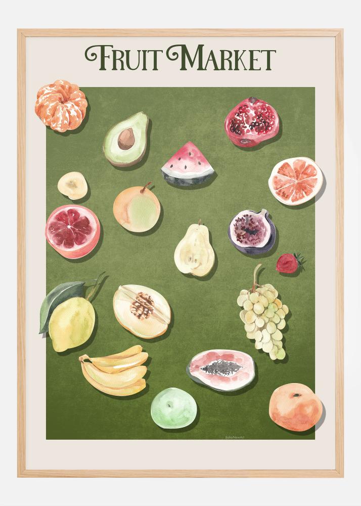 Den här färgstarka affischen fångar essensen av en livlig fruktmarknad och är en fantastisk tillägg till vår kollektion av inredningskonst. Printet är en fröjd för ögat med en rad saftiga frukter som presenteras mot en rik grön bakgrund, vilket skapar en känsla av färskhet och överflöd. Från de solmogna citrusfrukterna till de tropiska dragen av avokado och granatäpple, erbjuder detta verk en visuell fest som både inspirerar och förgyller. Varje frukt är skildrad med en detaljrikedom som framhäver deras unika texturer och former, vilket gör denna poster till ett måste för alla som uppskattar naturtrogen konst.