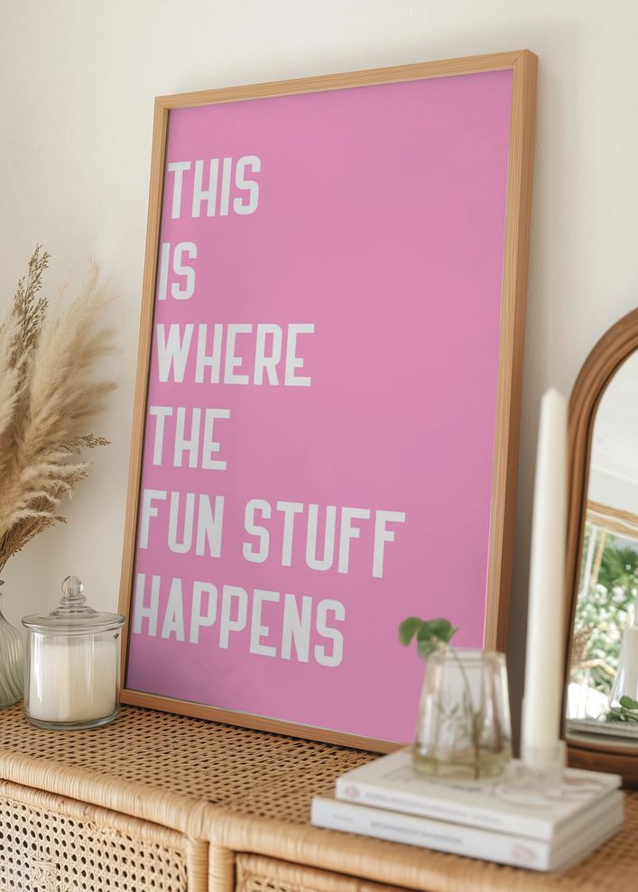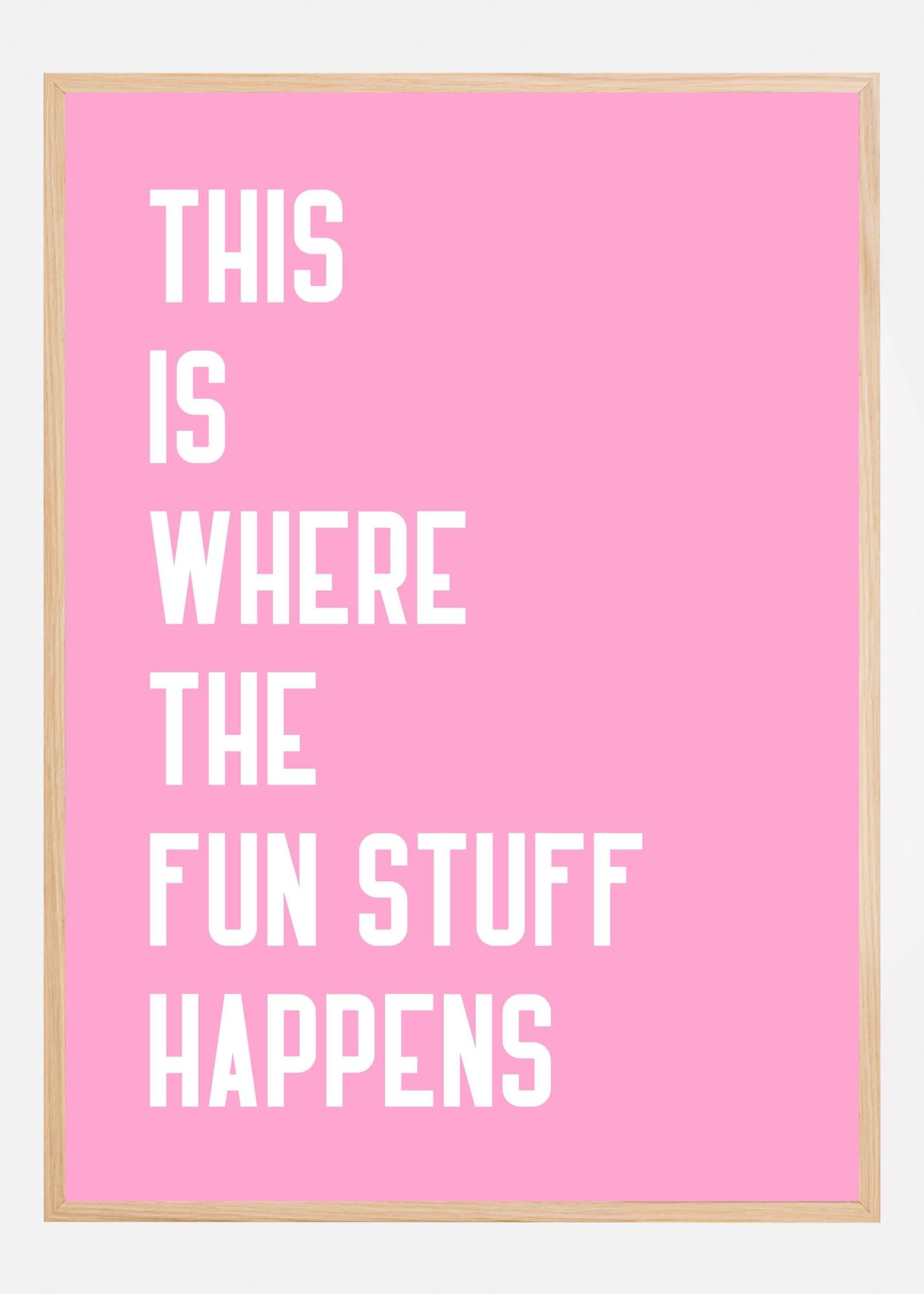 Denna moderna poster är perfekt för att liva upp vilket rum som helst. Med det lekfulla budskapet "This is where the fun stuff happens" är den idealisk för att skapa en glad och inspirerande atmosfär. Denna print passar utmärkt i ett vardagsrum, kontor eller barnrum och är ett stilfullt sätt att uttrycka personlighet och skapa en inbjudande miljö.