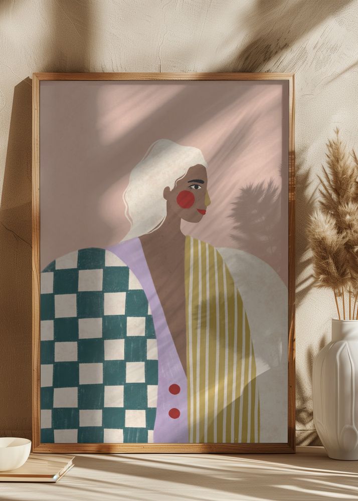 Denna samtida poster avbildar en stilfull illustration med en förenklad figur i profil. Figuren är klädd i en checkmönstrad kavaj i grönt och vitt samt en gulvit randig tröja, vilket skapar en känsla av elegans och modernitet. Den avslappnade posen förstärker det minimalistiska uttrycket i denna unika print, vilket gör den till ett perfekt tillskott i ett trendmedvetet hem eller kontor.