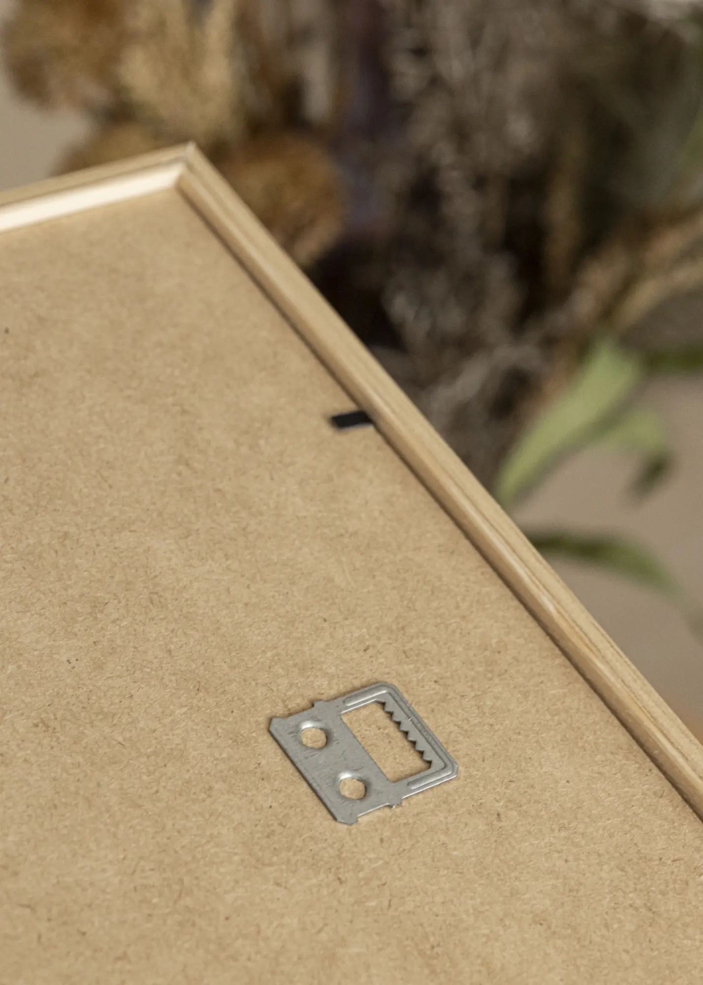 Detta är en tunn ram som passar perfekt när du vill låta allt fokus vara på motivet! Ramlisten 13 mm djup och 13 mm bred, vilket innebär att ramen har en smidig men ändå gedigen design. Ramen är tillverkad i furu och har en ekfärgad yta. På baksidan finns väggfästen för både liggande och stående upphängning.