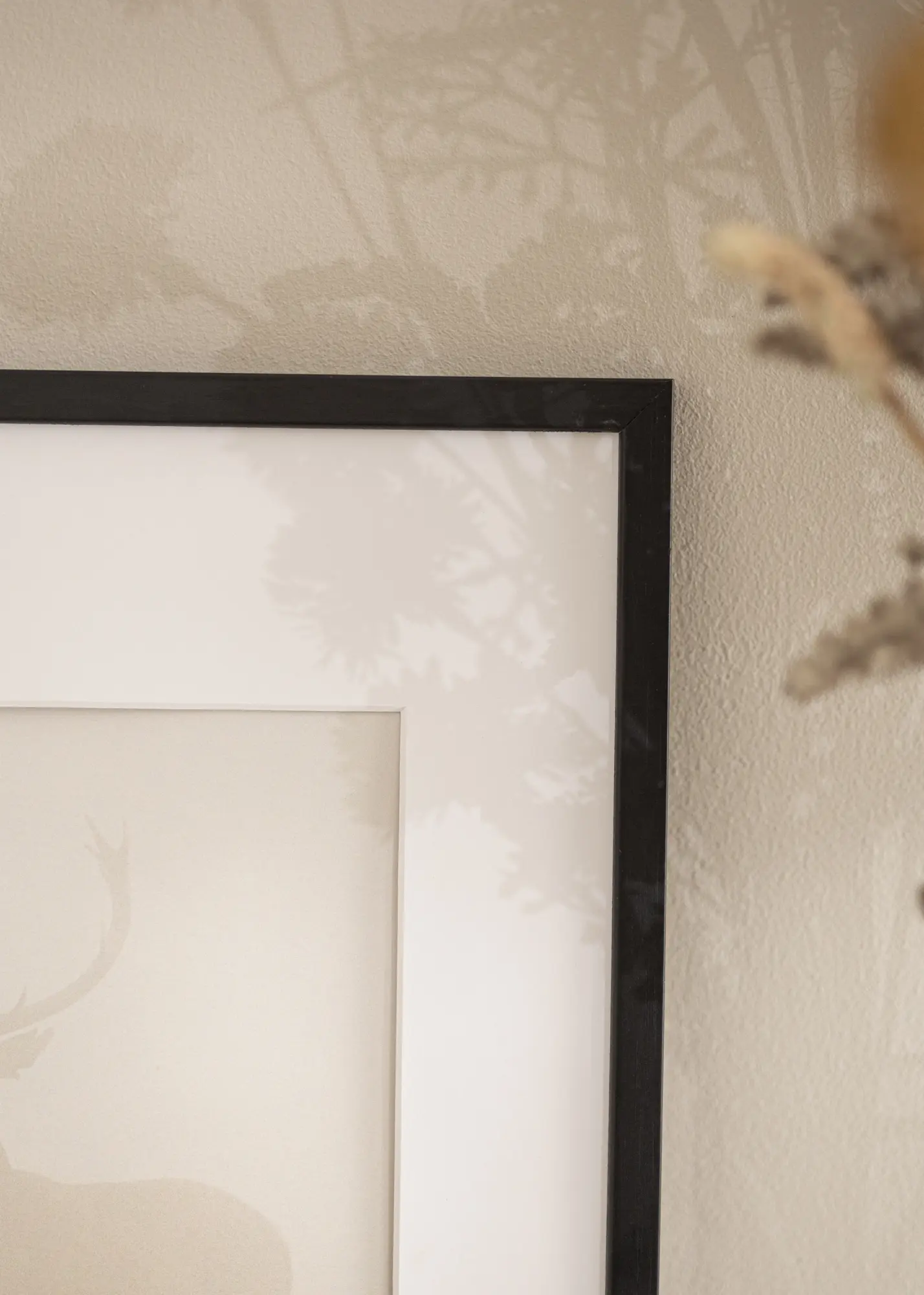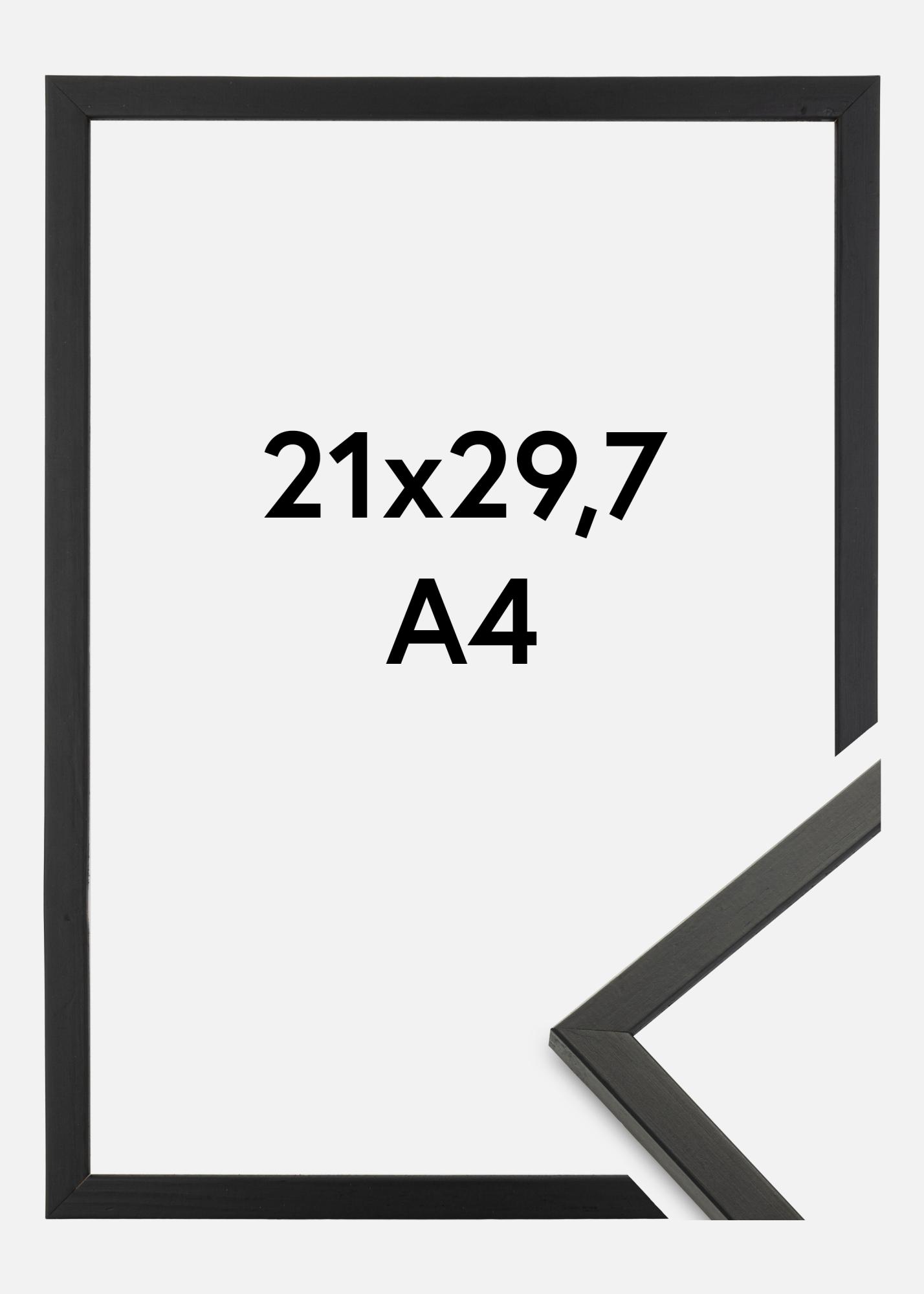 Klassisk svart tavelram i mörkt svart trä som passar motiv som är 21x29,7 cm (A4). Svarta ramar är en klassisker som passar till alla typer av motiv och går enkelt att kombinera med andra färger. Ramen har äkta glas vilket är något vi på BGA uppskattar då de ger en skarp bild på riktigt.