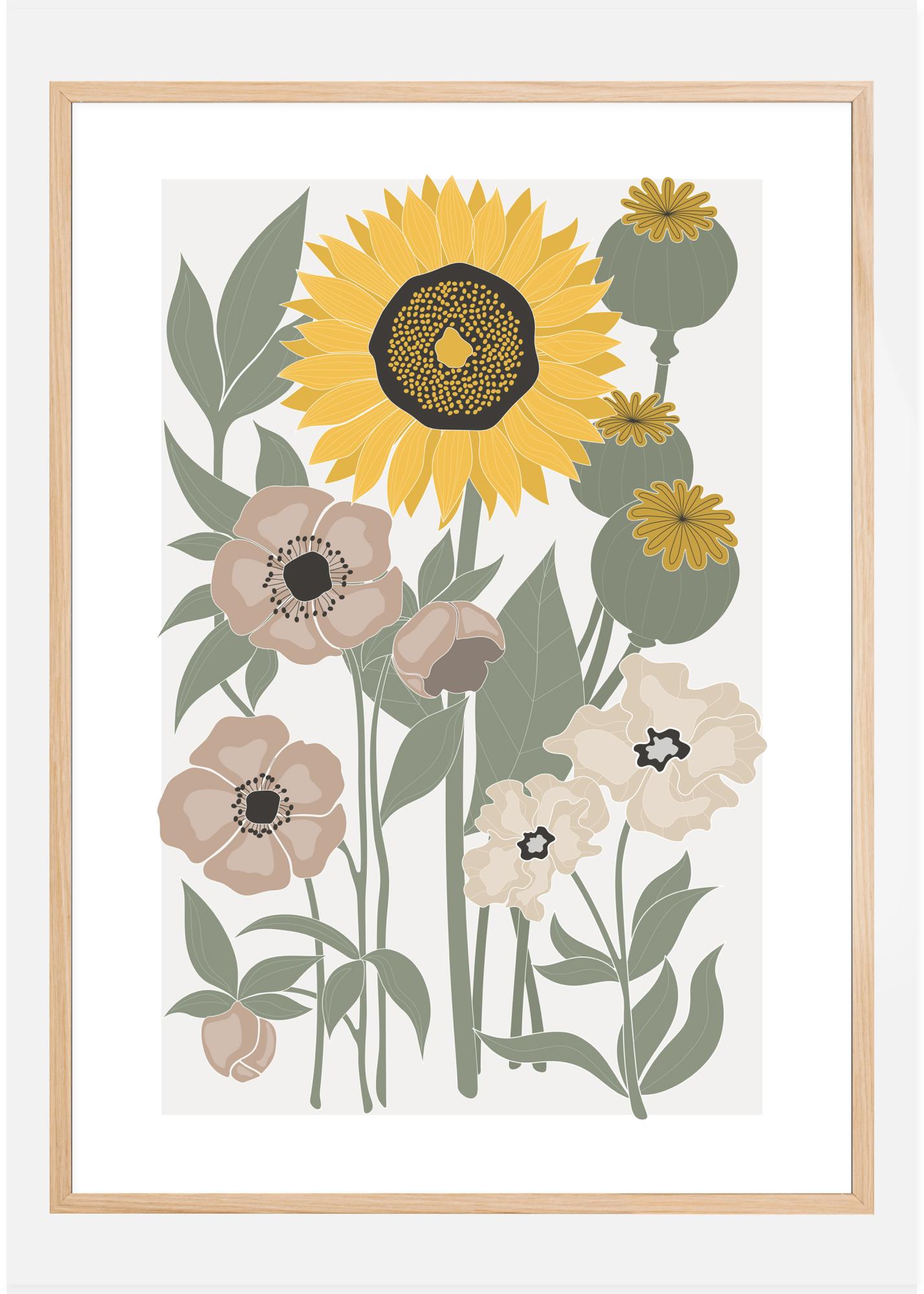 En mjuk poster med olika blommor. En ljus solros dominerar mitten av bilden tillsammans med andra blommor som vallmo i denna trädgårdsposter. Den enkla stilen gör det lätt att se detaljerna och njuta av den här soliga bilden.