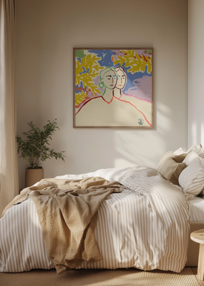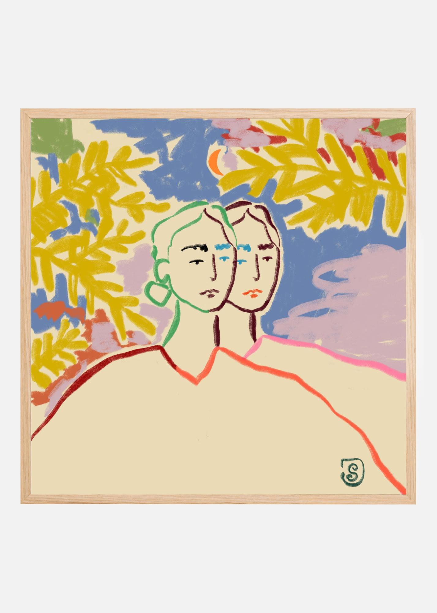 Denna färgstarka poster fångar essensen av modern konst med sina uttrycksfulla linjer och djärva färgkombinationer. Motivet visar två abstrakta ansikten i fokus, ritade med enkla men effektfulla streck, vilket ger en känsla av både mystik och intimitet. Omgivna av livfulla färger och stiliserade blad, bjuder denna print in till eftertanke och kreativ tolkning.