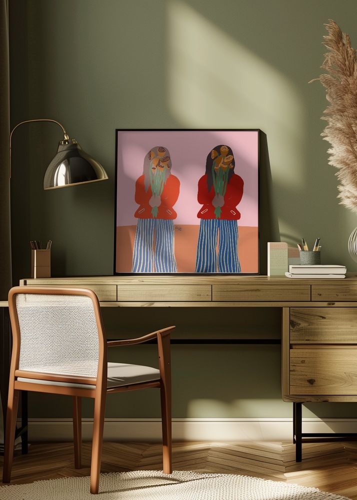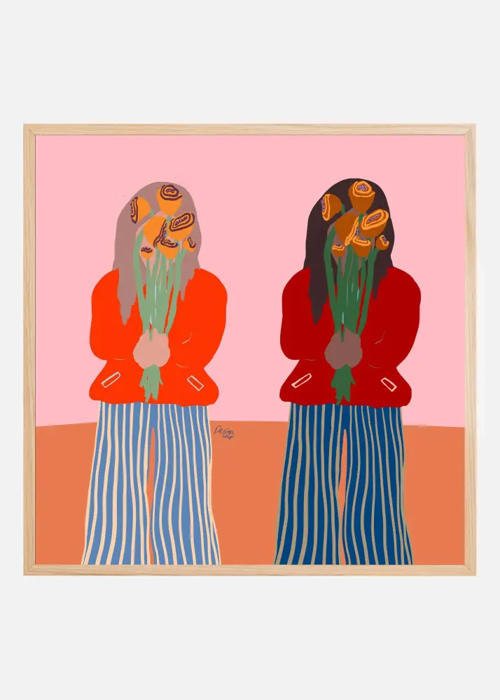 Upptäck vårt sortiment av konstnärliga posters som fångar ögat med sin unika stil. Denna specifika affisch framkallar en samtida känsla med sin abstrakta framställning av två figurer. De huvudsakliga färgerna i motivet är mjuka toner av rosa och korall som skapar ett varmt och välkomnande intryck, kontrasterat av de mer distinkta färgerna som mörkblått och terrakotta. Figurenas kläder ger en lekfull, grafisk effekt med ränder och solida färger som interagerar på en engagerande visuell yta.