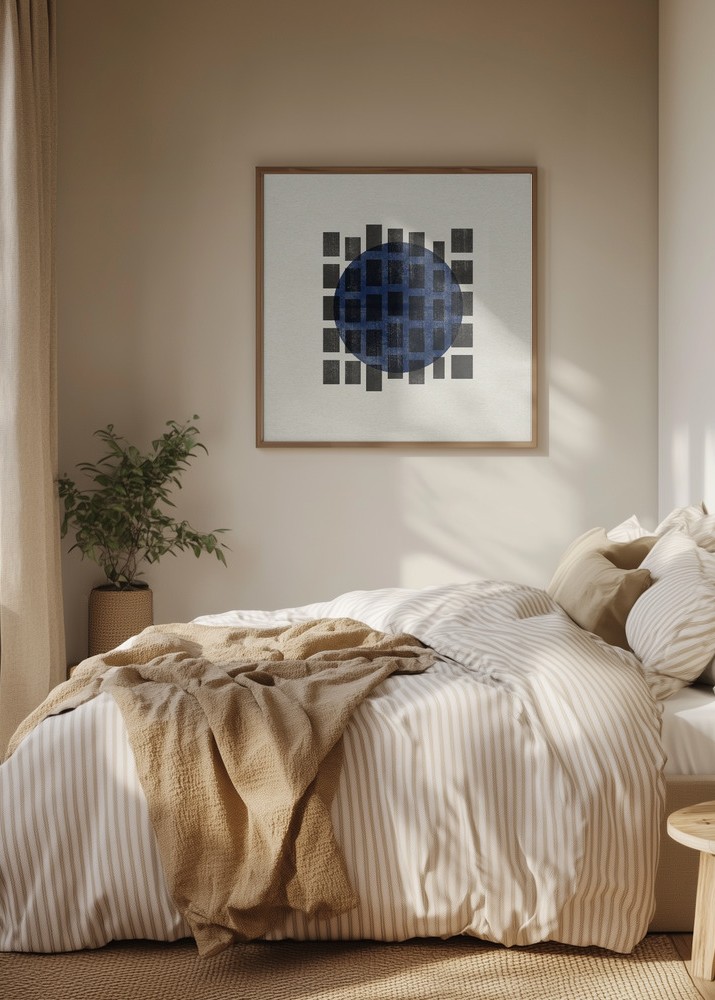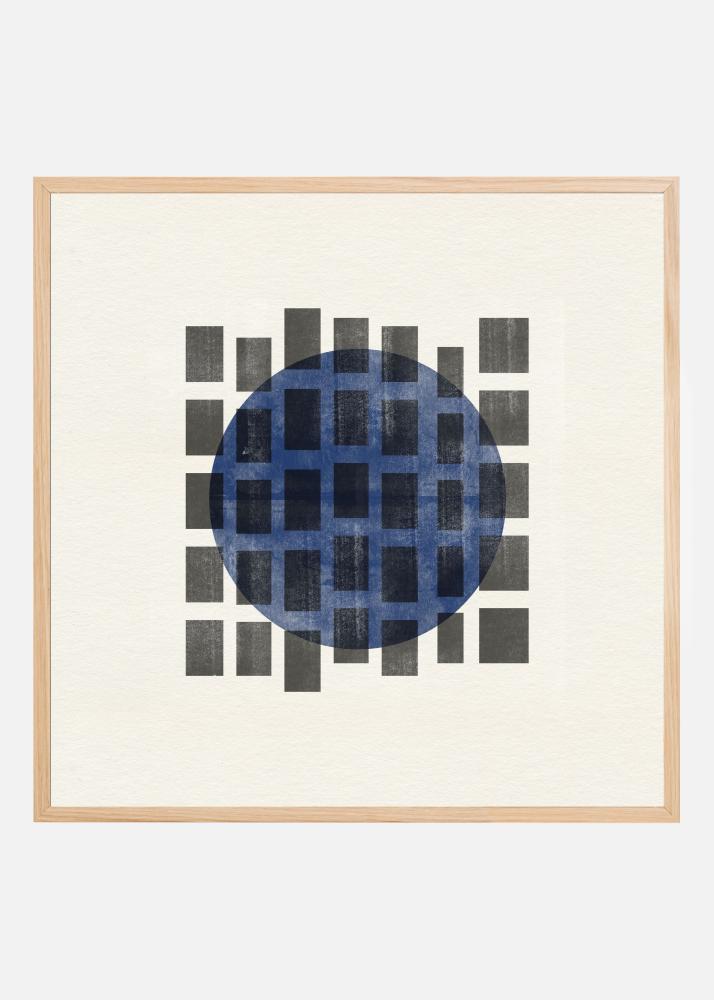 Denna poster erbjuder ett stilrent och modernt motiv som enkelt kompletterar olika inredningsstilar. Centralt i designen finns en djupblå oval som ger en känsla av lugn och balans. Runt ovalen är ett rutmönster i olika nyanser av grått och svart vilket skapar ett intressant djup och kontrast.