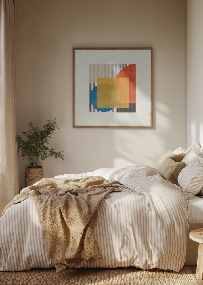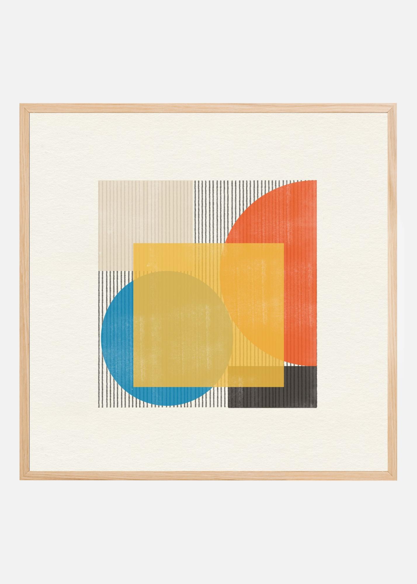 Denna moderna affisch kombinerar geometriska former med en känsla av minimalistisk elegans. Centralt i motivet finns en stor blå cirkel som harmoniserar med en överlappande gul kvadrat, vilket skapar en spännande visuell dynamik. En varm orange halvcirkel bryter av med extra liv och kompletterar färgpaletten. Bakgrunden pryds av vertikala linjer i svart och grått, vilket ger ytterligare djup och textur till designen.