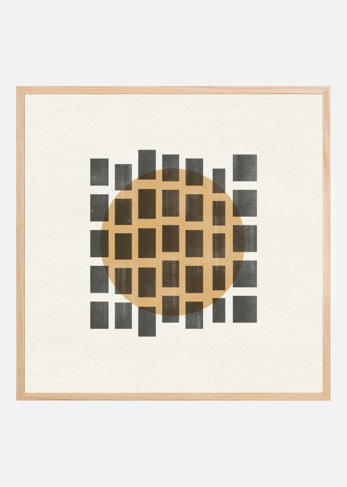 Upplev en smakfull kombination av modern design och tidlös stil med denna affisch. Motivet består av ett rutnät av fyrkantiga former i en elegant och djup kolsvart nyans. Denna strukturerade bakgrund skapar en fascinerande kontrast mot den centrala ovala formen, som är färgad i en varm ockragul ton. Tillsammans bildar dessa element en harmonisk balans som fångar ögats uppmärksamhet.