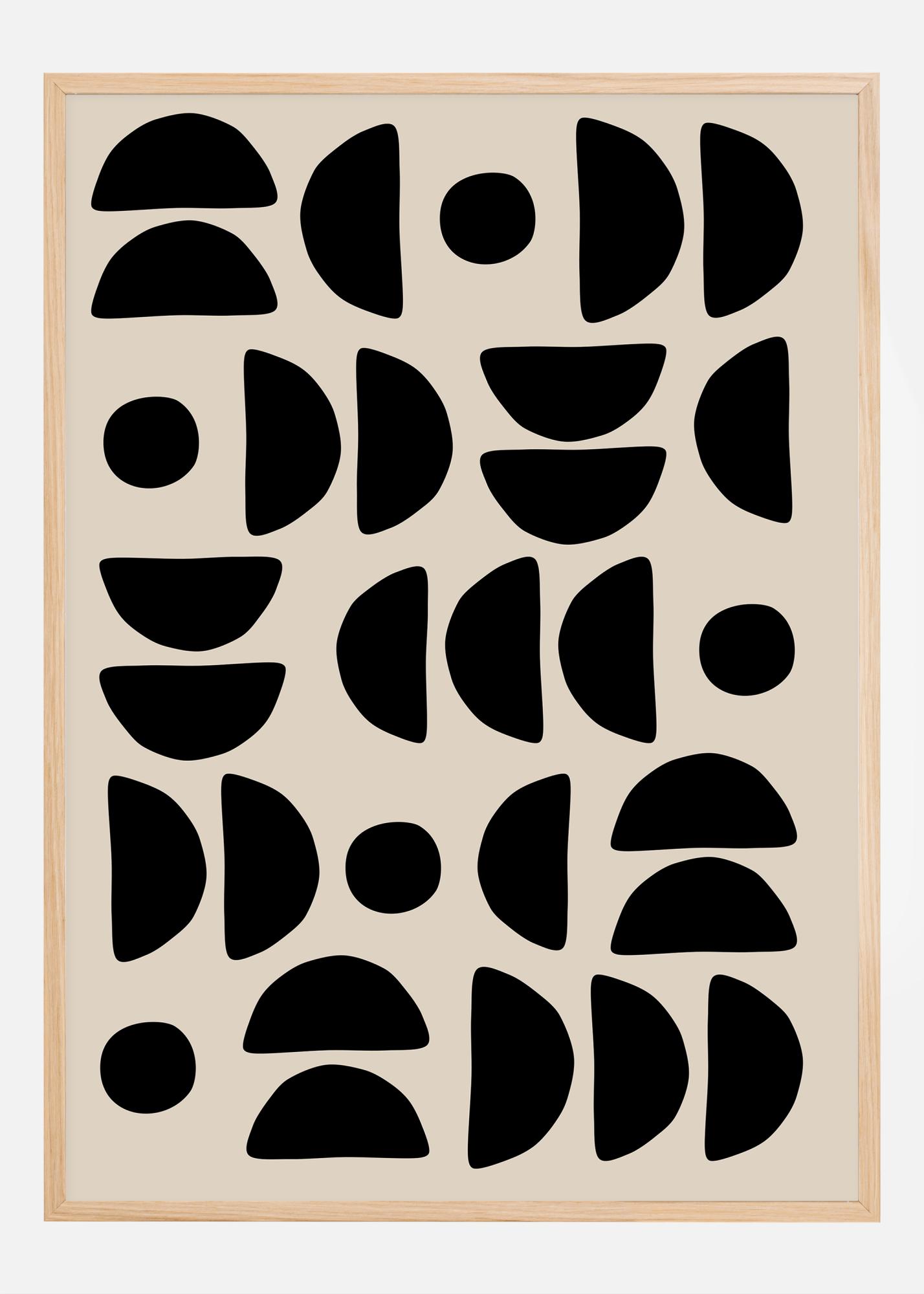 Denna konstnärligt framställda poster utmärker sig med sitt djärva mönster av geometriska former i svart mot en beige bakgrund. Den abstrakta designen är lekfull och rytmisk, vilket skapar en visuell spänning som är både modern och tidlös. Detta verk kan uppfattas som en hyllning till både den organiska världen och de konstruerade elementen inom den grafiska designen, och passar perfekt för dem som värdesätter konst med starka, rena linjer och kraftfulla kontraster.