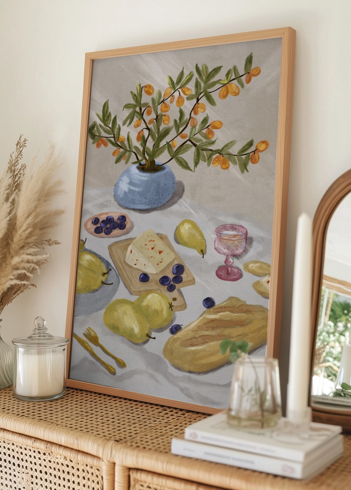 Den här trendiga postern erbjuder en stilfull representation av en klassisk stillebenuppsättning med en delikat förening av vintage och modern stil. Motivet illustrerar en inbjudande scen med mogna päron, krispiga druvor och oliver som vilar runt en samling av ost på ett träbräde. I bakgrunden står en blå vas med livfulla orange kvistar som ger en känsla av rörelse och friskhet till affischen.