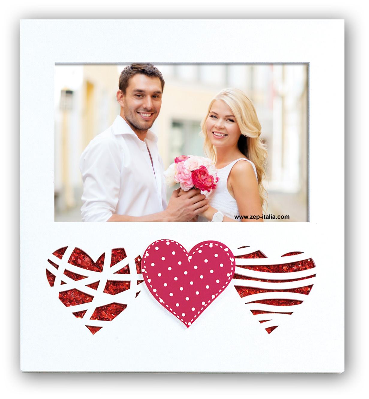Elegant fotoram med kärlekstema med tre söta hjärtan i olika mönster där hjärtat i mitten dessutom står ut från ramens övriga profil. Perfekt bild på dig och din älskling!