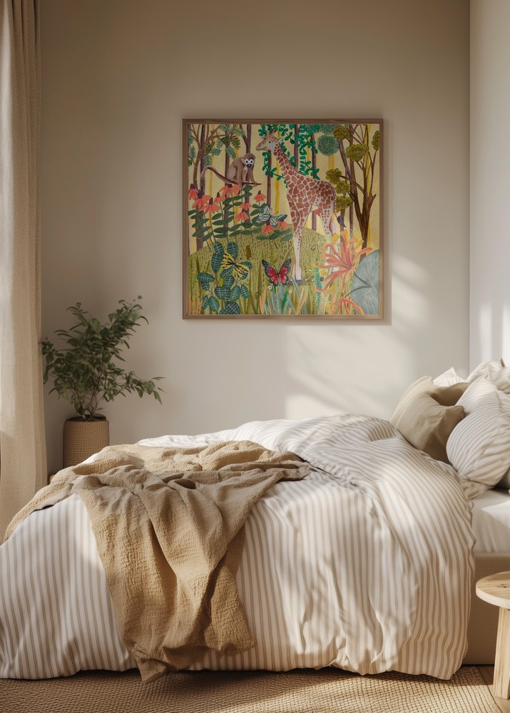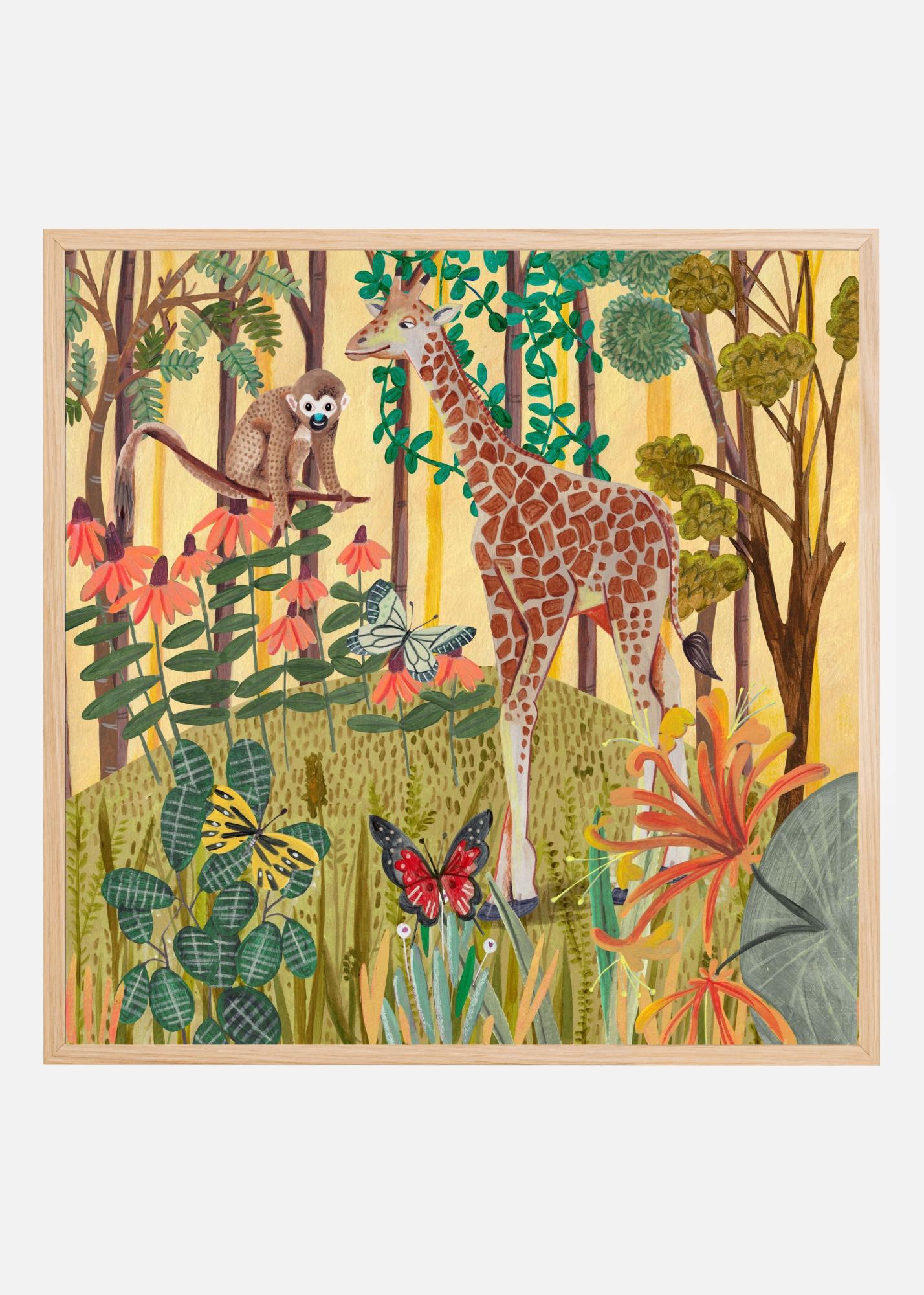 Denna poster fångar en livfull och charmig scen från djungeln, där en giraff och en nyfiken apa står i fokus. Omgivna av frodiga gröna blad och färgglada blommor, ger motivet en känsla av äventyr och upptäckarlust. Fjärilar fladdrar runt, vilket tillför en extra dimension av liv och rörelse till detta unika print. Häng upp denna affisch för att ge rummet en touch av det exotiska och stimulera fantasin hos både vuxna och barn.