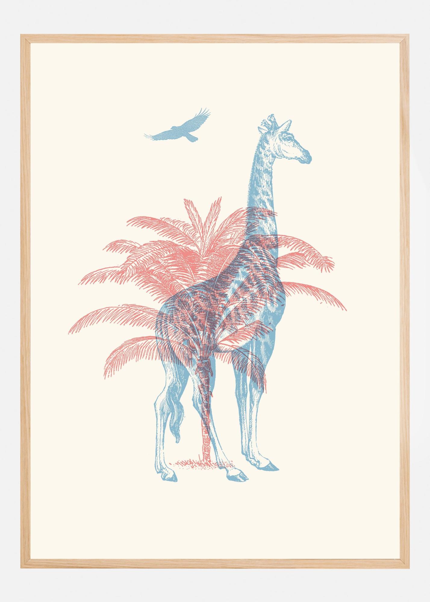 I motivet svävar en ensam fågel över giraffen, vilket ger en känsla av frihet och rörelse till den stilla scenen. Färgskalan i denna affisch är både avslappnad och inbjudande, med en dominans av varmt beige i bakgrunden som kompletteras av detaljrikedomen i giraffens och palmernas intrikata teckningar i röda och blåa toner. Denna print är en perfekt kombination av natur och konst som passar utmärkt för den som uppskattar stilren design och en kärlek till djurriket.