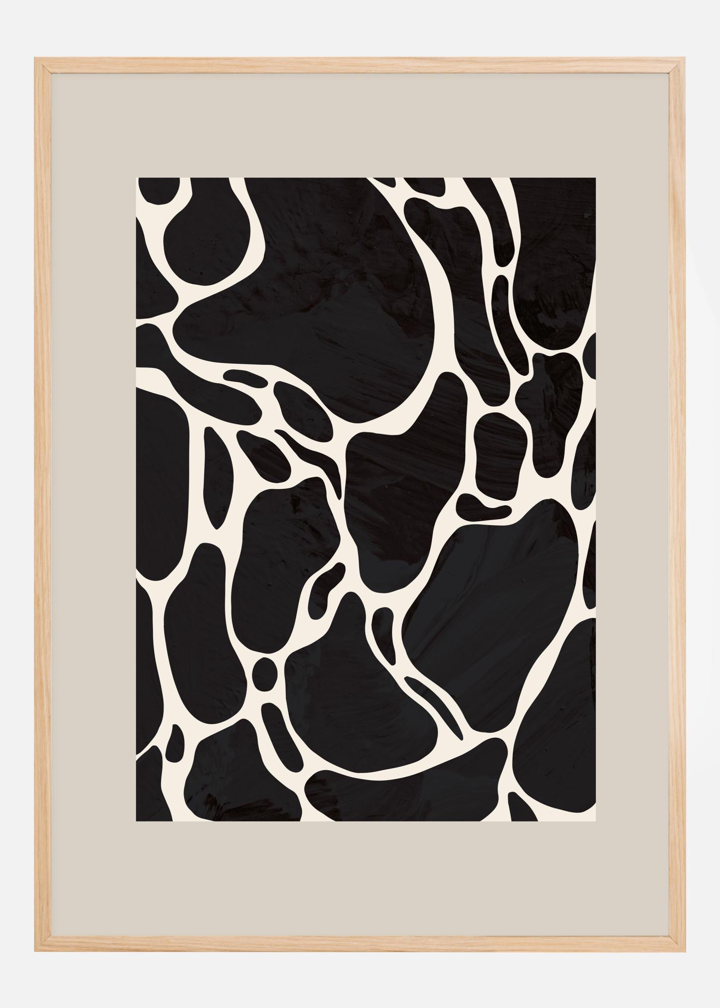 En grafisk poster med giraffläckar i svart och vitt. De stora färgblocken i svart skapar en lockande bild medan penseldragen i dem ger extra struktur. De tjocka vita linjerna skär igenom giraffens fläckar och skapar flöde och rörelse i bilden.