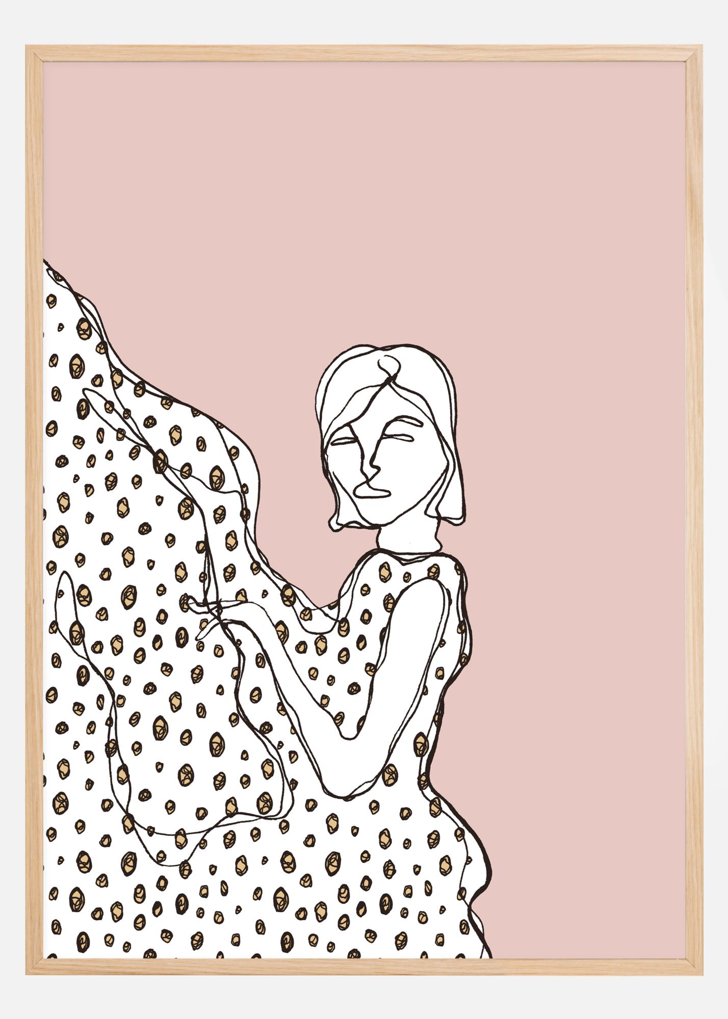 En enkel poster med en skissad tjej i en prickig klänning. Den grova skissen av flickan skapar rörelse när hon virvlar sin klänning uppåt. De enkla prickarna sticker ut mot den bleka pastellrosa bakgrunden som hon står framför. Fånga hennes blick när hon tittar på dig.
