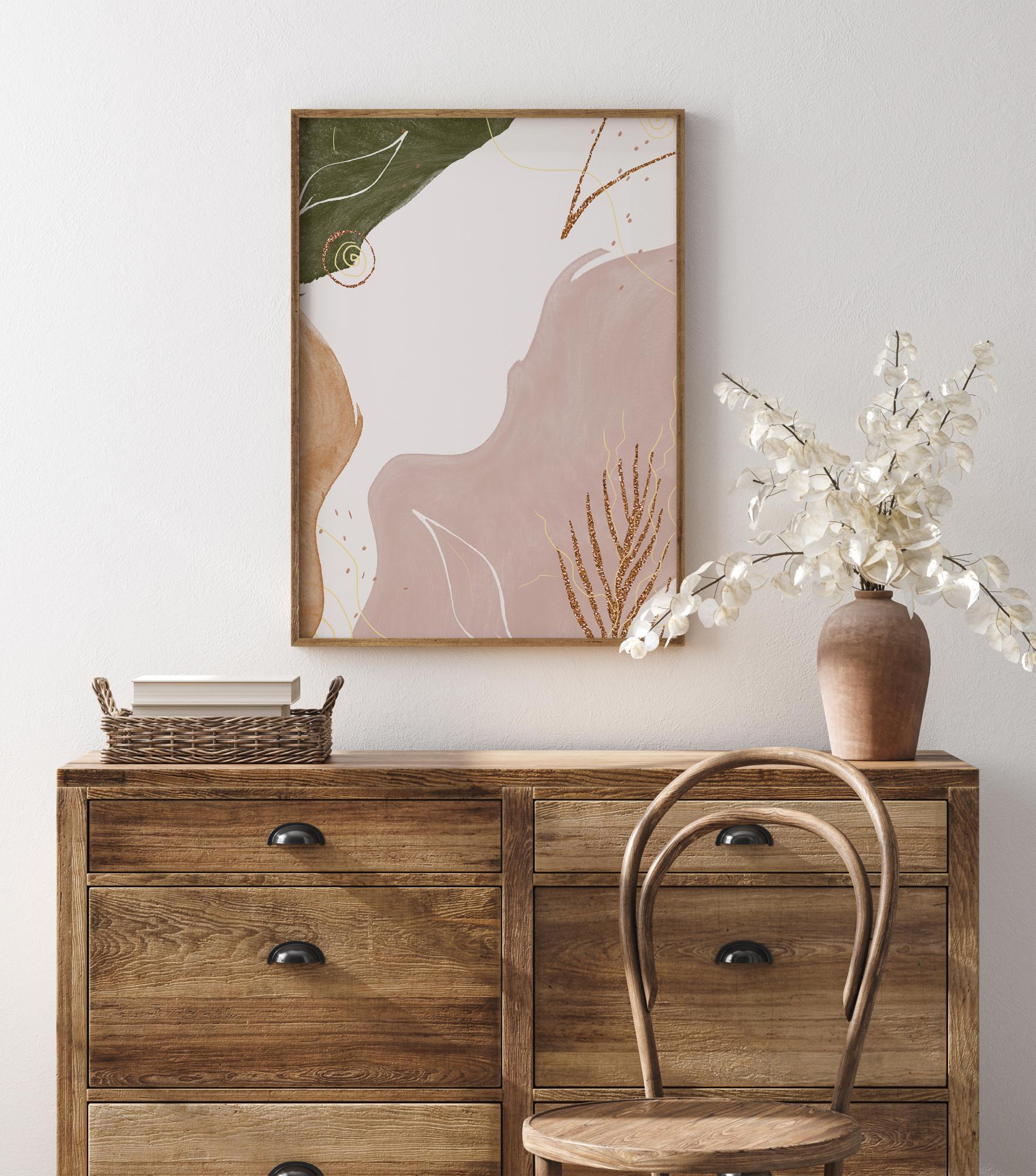 En fridfull abstrakt poster med löv och glittrande detaljer. Stora, bladformade block av färg fyller denna affisch med små kvistar och grenar som skapas av glittrande guld. Matcha denna med någon pastellfärg för ett snyggt tillskott på din vägg.