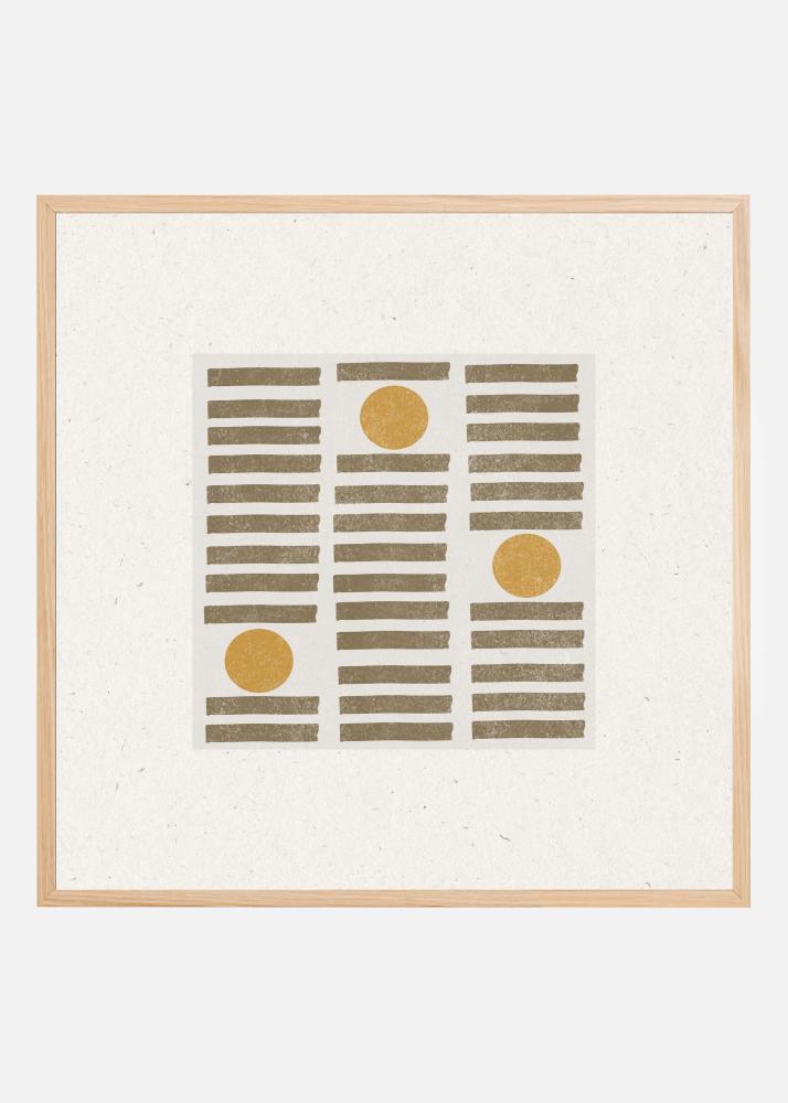 De gyllene cirklarna i printet bryter de jordnära nyanserna med en varm gul färg, vilket ger affischen en unik och lekfull twist. Kombinationen av färger och former gör detta till en iögonfallande affisch som kan bli en favorit i din samling av konst. Perfekt för dem som söker efter något modernistiskt och subtilt samtidigt.