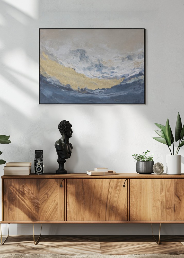 Denna affisch passar utmärkt i moderna hem eller kontor där stil och estetik värdesätts. De djupa blå tonerna i det nedre partiet av printen balanseras galant av den ljusa, vita himlen och gnistrande guld, vilket skapar en känsla av rörelse och dynamik. Denna poster är ett perfekt val för dem som vill lägga till en touch av sofistikering och samtidskonst i sina utrymmen.