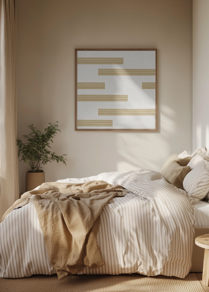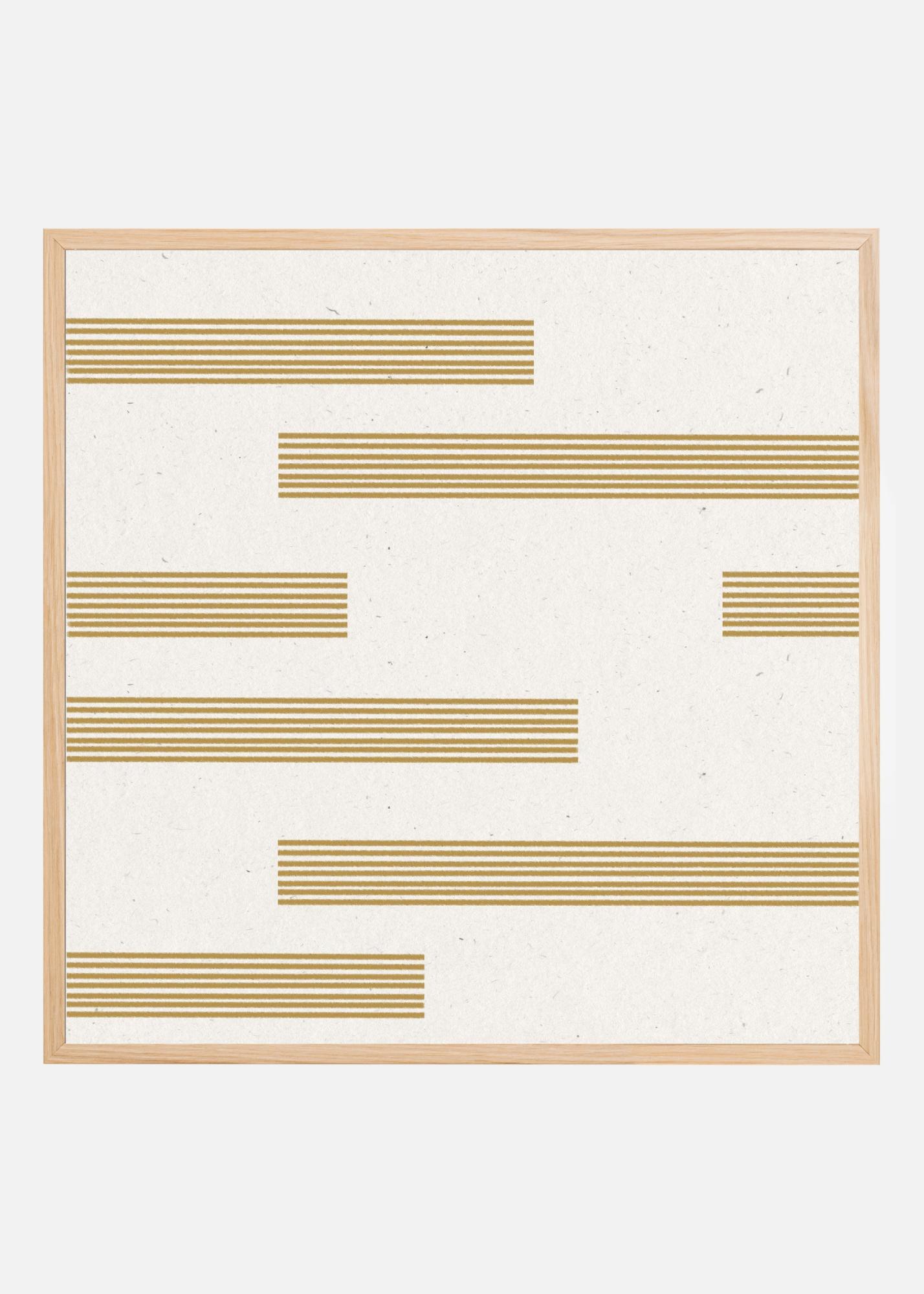 Motivet domineras av varma guldfärgade linjer som elegant kontrasterar mot en ljus, vit bakgrund. Färgpaletten gör den här printen enkel att matcha med andra dekorativa element i ditt hem. Perfekt för vardagsrum, sovrum eller kontor, denna affisch tilför en touch av sofistikerad enkelhet.