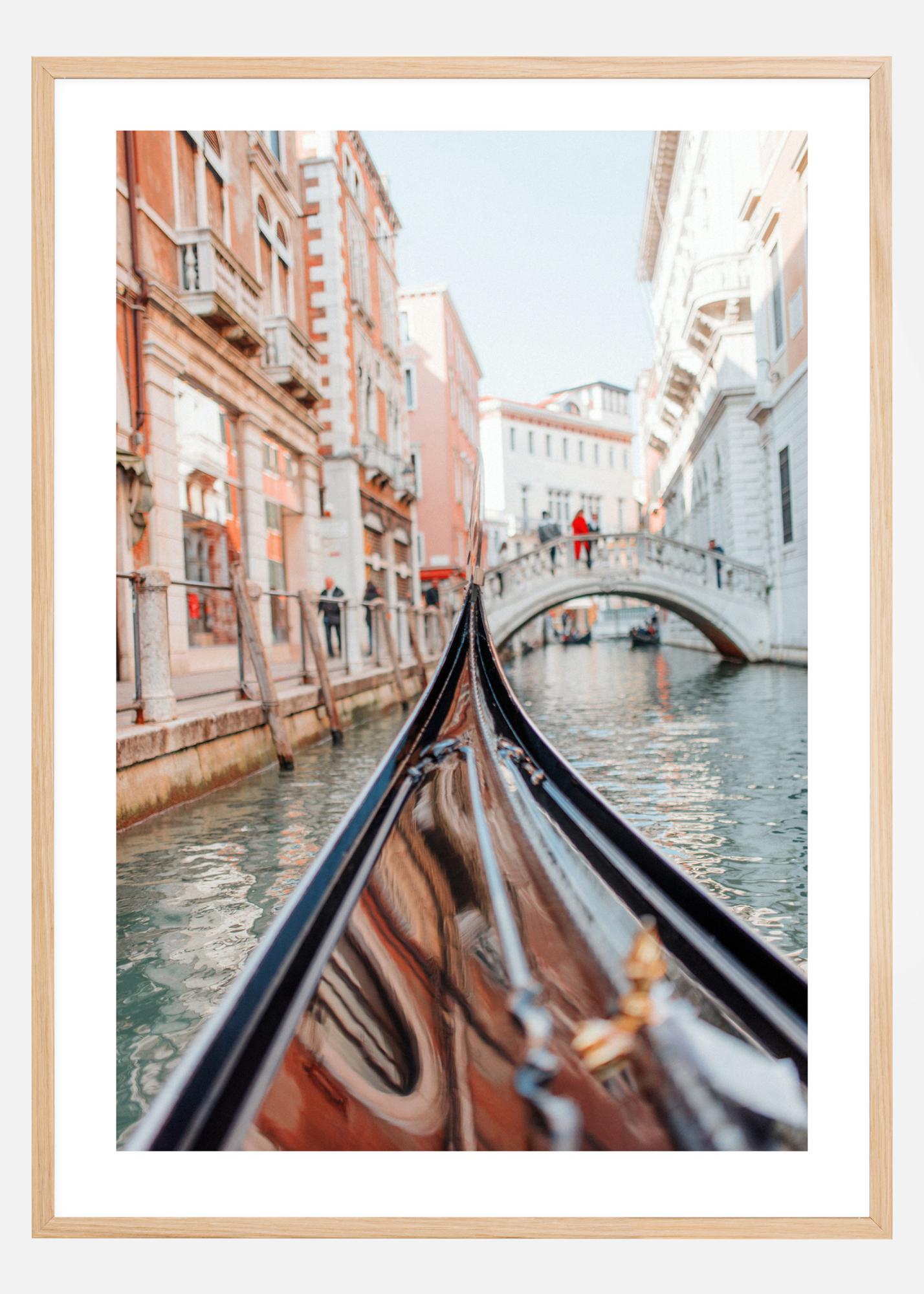 En klassisk poster med fören på en gondol som flyter genom kanalerna i Venedig. Kanalen passerar mellan mjukt rosa och vita hus, på väg mot en vit bro där människor står och tittar på. Föreställ dig att du är på semester när du tar med bilden hem.
