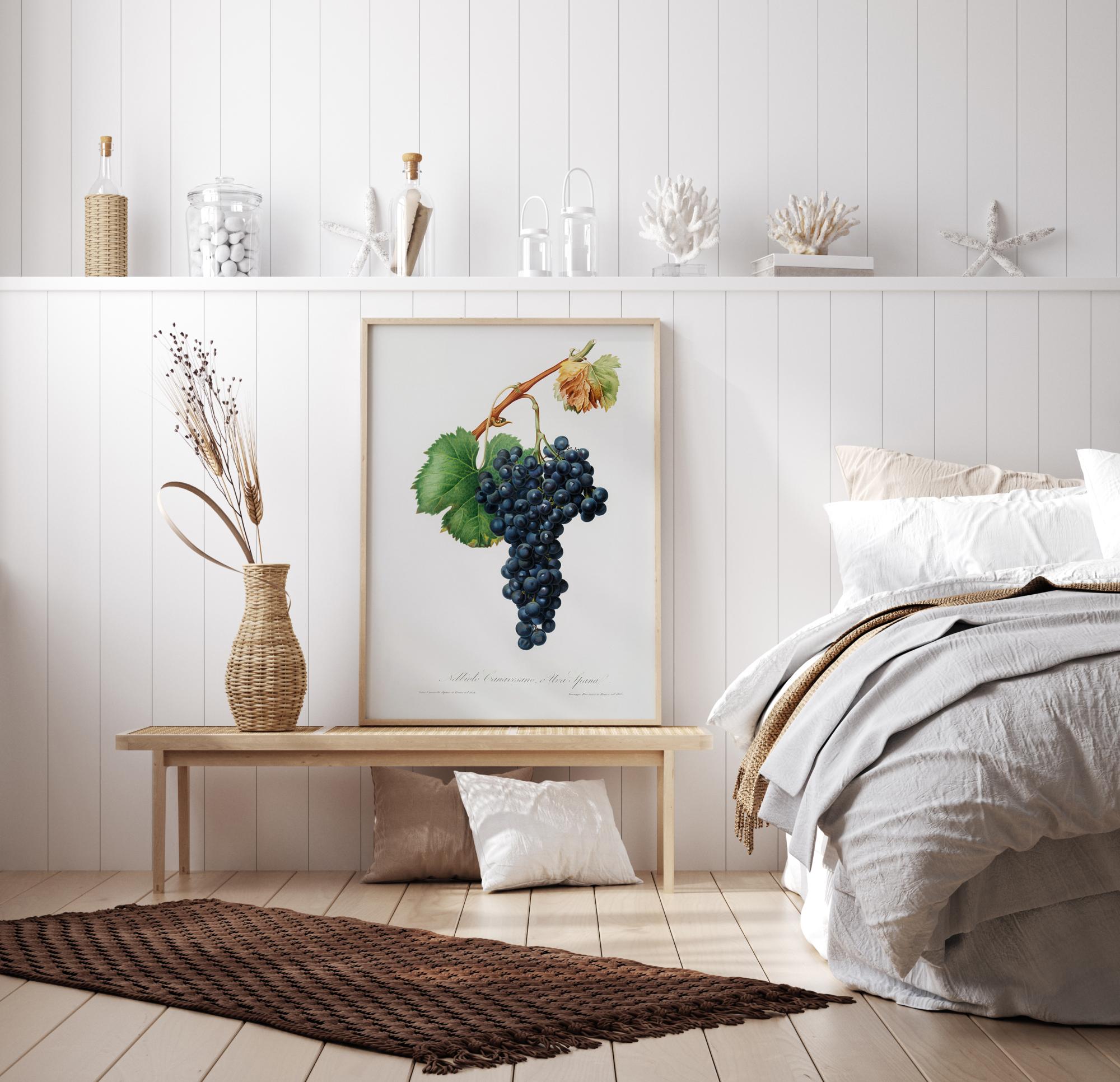 En detaljerad botanisk poster med många mörkt blå druvor på en vinstock som hänger i mitten mot en vit bakgrund. De glansiga svartblå druvorna ser saftiga och goda ut och dinglar lockande i mitten av bilden. Häng den här i ditt kök för lite matinspiration.