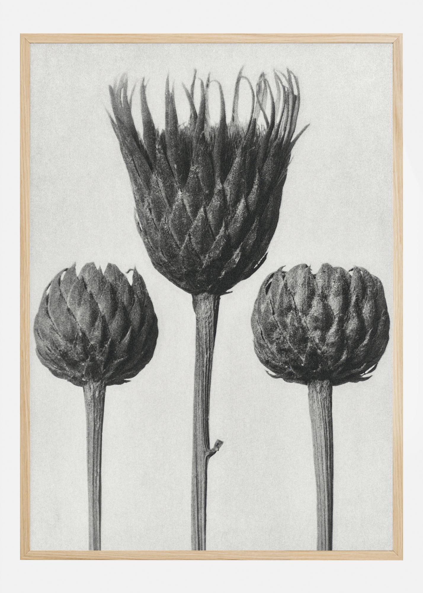 En naturposter med tre grå blommor med en enda stjälk. De tre grå blommorna står högt mot en vit bakgrund och är nästan placerade sida vid sida. Den grå blomman i förgrunden har öppnat sig mer än de mindre blommorna. Det här är det perfekta trycket att hänga i din vinterträdgård.