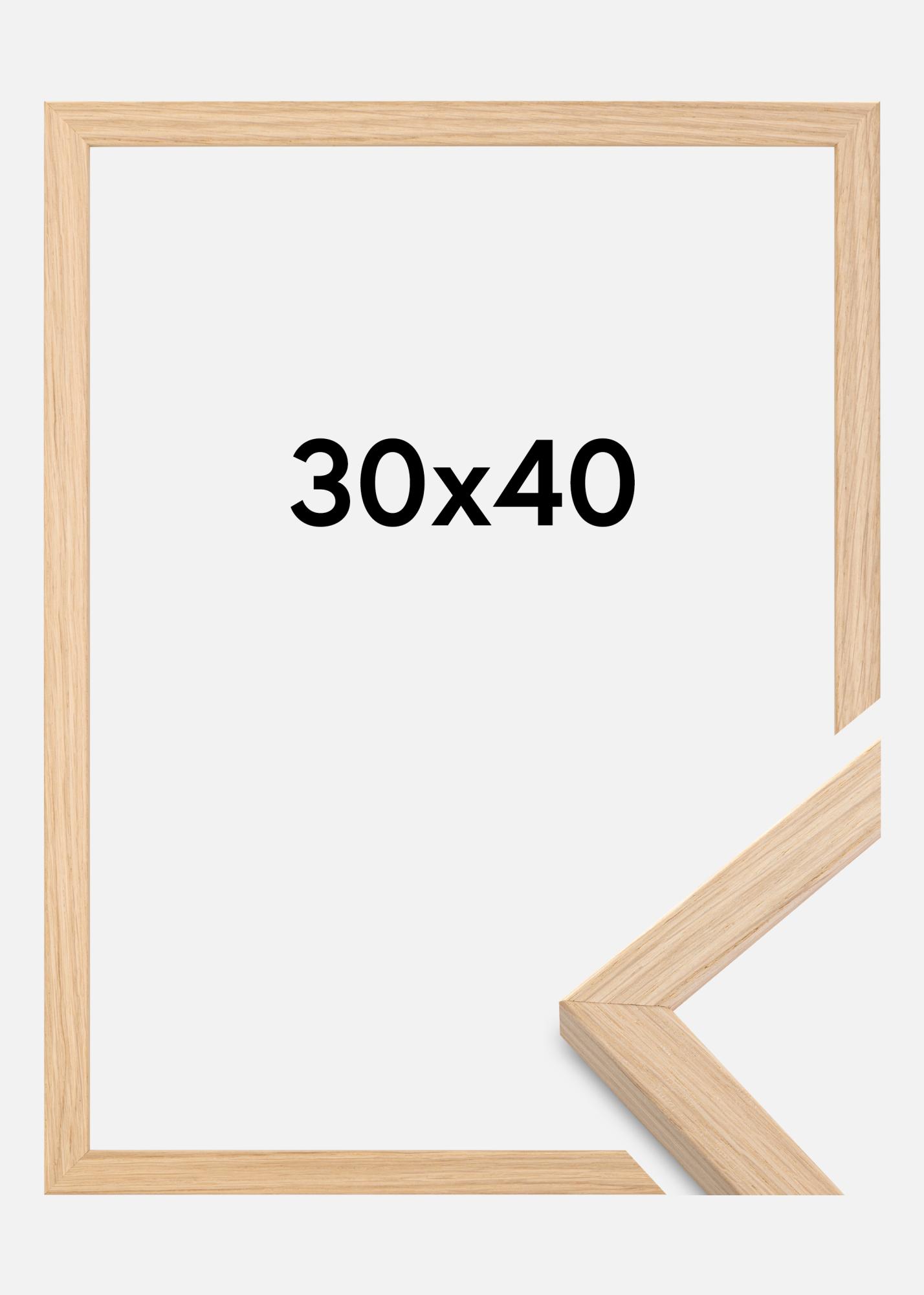 Grimsåker Ram Ek 22A 30x40 cm har innermåtten 30x40 cm medan listen mäter 1,7x2,25 cm.