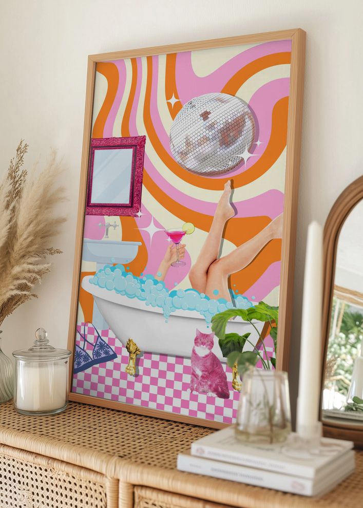 Denna livfulla poster utstrålar en retro, chic atmosfär med starka toner av rosa, orange och gul i en psykedelisk bakgrund. Mittpunkten är ett stiliserat badkar fyllt med bubblor, där ett par ben sträcker sig elegant i luften, hållande en cocktailglas med en limeskiva. Denna print fångar känslan av avslappnad lyx och kreativitet, perfekta för att ge ditt rum en unik och färgstark karaktär.