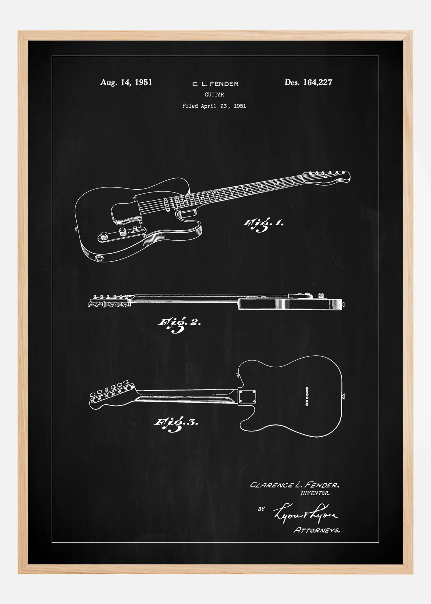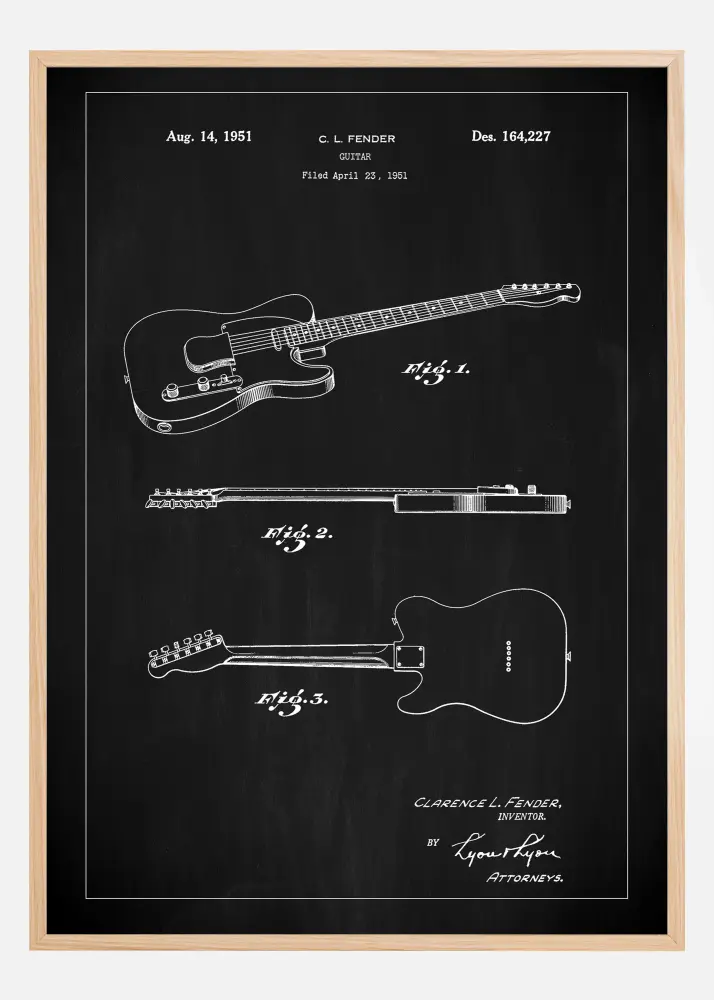 Denna patentposter med svart tavla bakgrund ger en stark visuell effekt, perfekt för att framhäva designen av Clarence L. Fenders elgitarr, patentnummer 164,227 från den 14 augusti 1951. Gitarrens ikoniska konturer och detaljer avtecknar sig skarpt mot bakgrunden, vilket ger en ren och distinkt framställning av instrumentet från tre olika perspektiv.