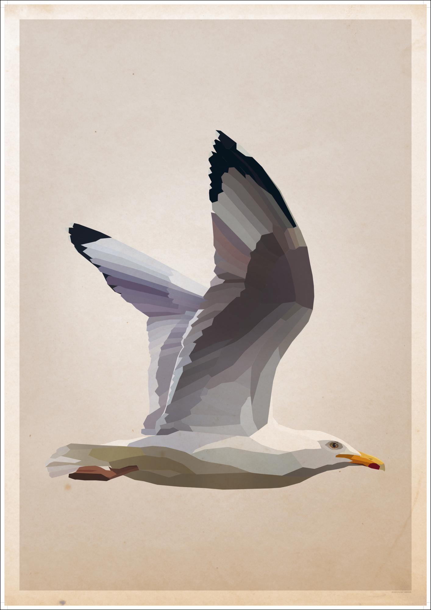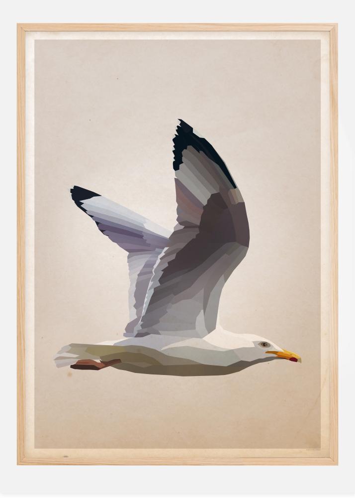En förtjusande poster med en glidflygande mås. Med sina brett utbredda vingar som slår mot havets salta luft kan du nästan höra dess rop på mat. Pastellfärgerna i det här trycket skapar en lugn atmosfär. En perfekt bild för alla fågelälskare.