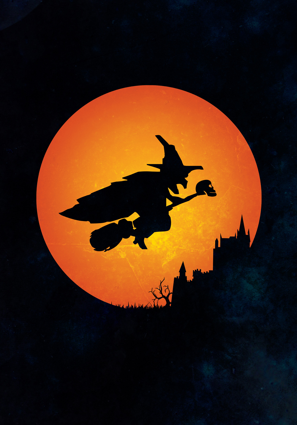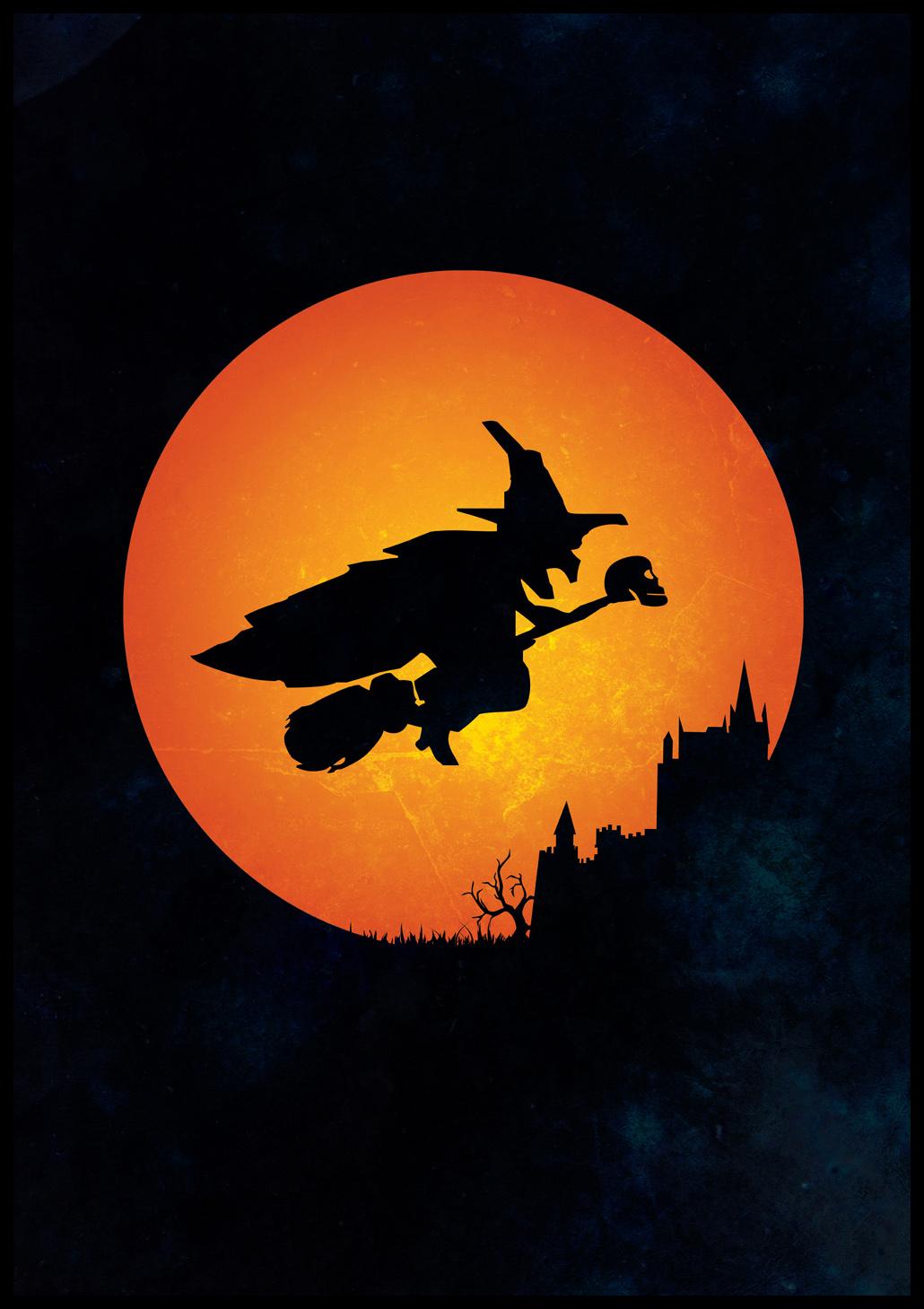 Temaposter för alla halloweenfester, eller till att dekorera hemmet med för den som har en dragning till häxor. Den svarta silhuetten av en häxa flygandes på en kvast och ett spöklikt slott mot den pumpaorangefärgade månen ger ett spännande motiv som blir pricken över i:et i temadekorationerna. Postern blir snyggast att rama in med en svart ram som inte konkurrerar med motivets färgskala.