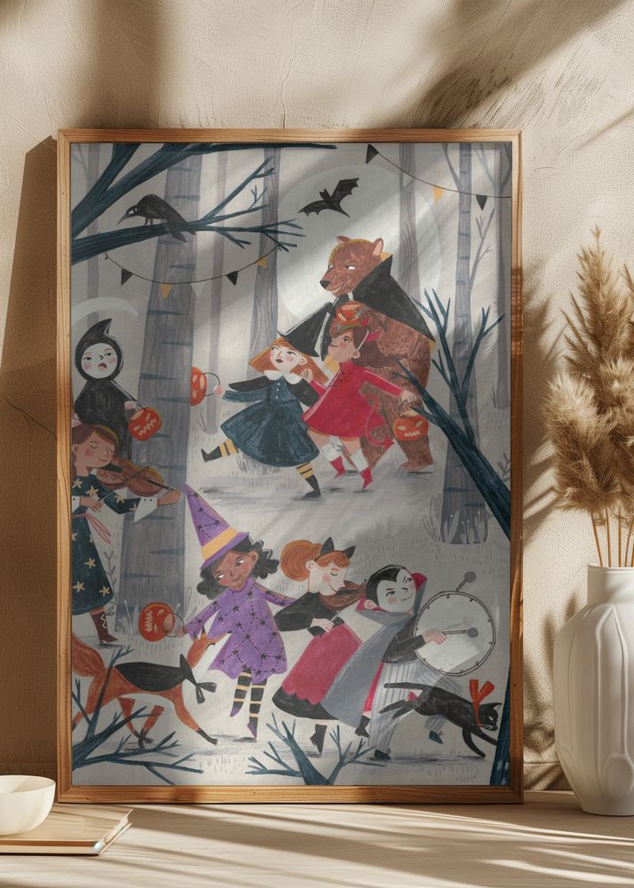 Denna charmiga och lekfulla poster fångar essensen av Halloween med en skogsmiljö som bakgrund. På motivet ser vi en grupp barn klädda i olika kostymer, såsom en häxa, vampyrer, ett spöke och en rödklädd karaktär med en varulvs mask. De firar tydligt denna festliga högtid med pumpor och godissamling. Runtom barnen fladdrar fladdermöss och en mångfald av träd prydda med orange och bruna höstlöv skapar en stämningsfull atmosfär.