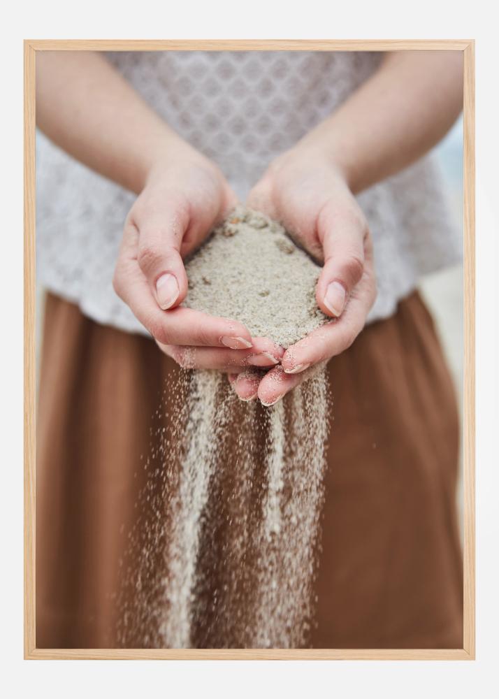 En mjuk och lugnande poster med en flicka som håller sand i sina händer. Den fina sanden faller genom hennes fingrar. Klädd i subtilt färgade kläder gör att det blir en mycket lugnande bild. Ett fridfullt och avkopplande foto som skulle passa perfekt på en beige vägg i något av rummen hemma hos dig.