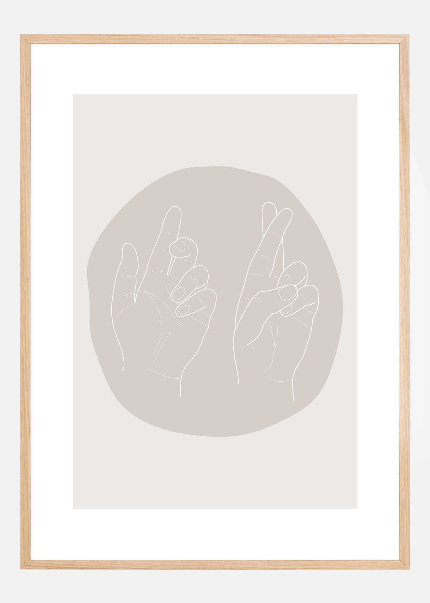 En enkel poster av två vänsterhänder mot en rund beige form. Cirkeln har placerats på en hudfärgad bakgrund med båda händerna pekande mot posterns övre kant. Händerna är avslappnade och skapar en lugn atmosfär i ditt hem. En perfekt bild för ditt arbetsrum.