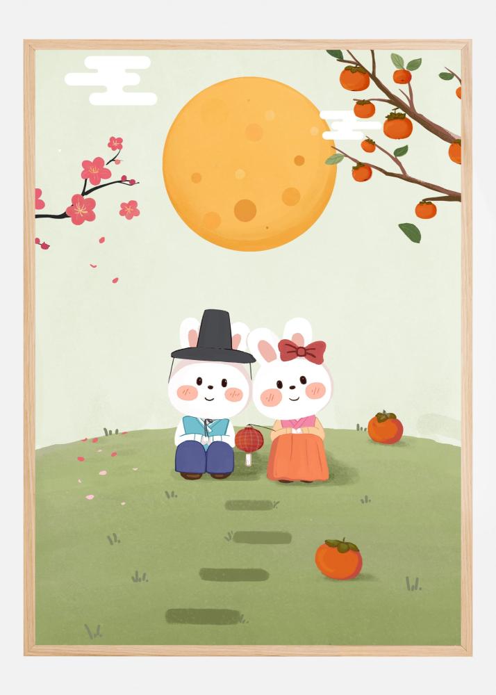 Upplev den fridfulla charmen med vår förtjusande affisch, perfekt för att införa en känsla av lantlig idyll i ditt hem. Denna bedårande print avbildar två söta tecknade karaktärer klädda i traditionell klädsel sittandes på en lummig grön äng. De omges av ett underbart landskap med en stor, varm orange sol som strålar i bakgrunden och lätta moln som sveper förbi på himlen. Blommor i nyanser av rosa och vita blomblad kompletterar den passepartout-lika kanten, medan trädet till höger ger en känsla av natur med sina ljusgröna löv och orangea frukter.