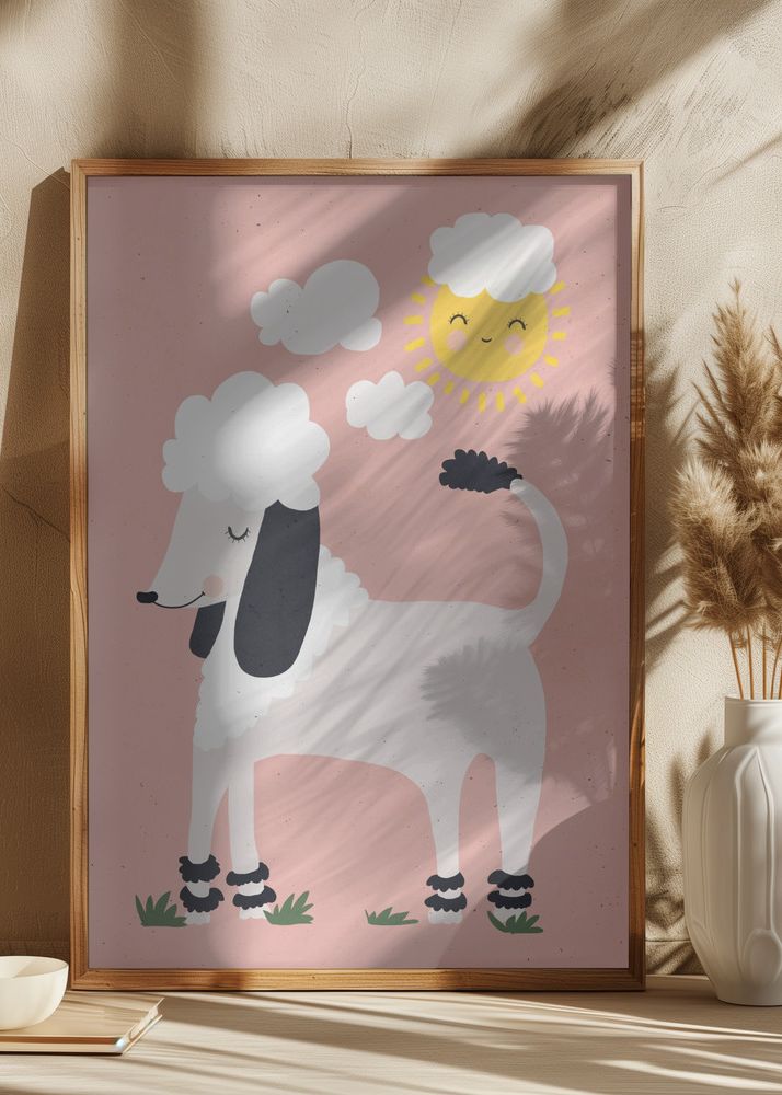 Upplev en charmig och lekfull atmosfär i ditt hem med denna bedårande poster som framställer en tecknad, vit ullig hund under en strålande gul sol och fluffiga vita moln. Denna print är perfekt för att addera en dos av barnslig glädje och värme till rummet. Dess lättsamma illustration är framhävd av en mild rosa bakgrund, och passar utmärkt i ett barnrum eller som en gullig touch i en annan del av ditt hem.