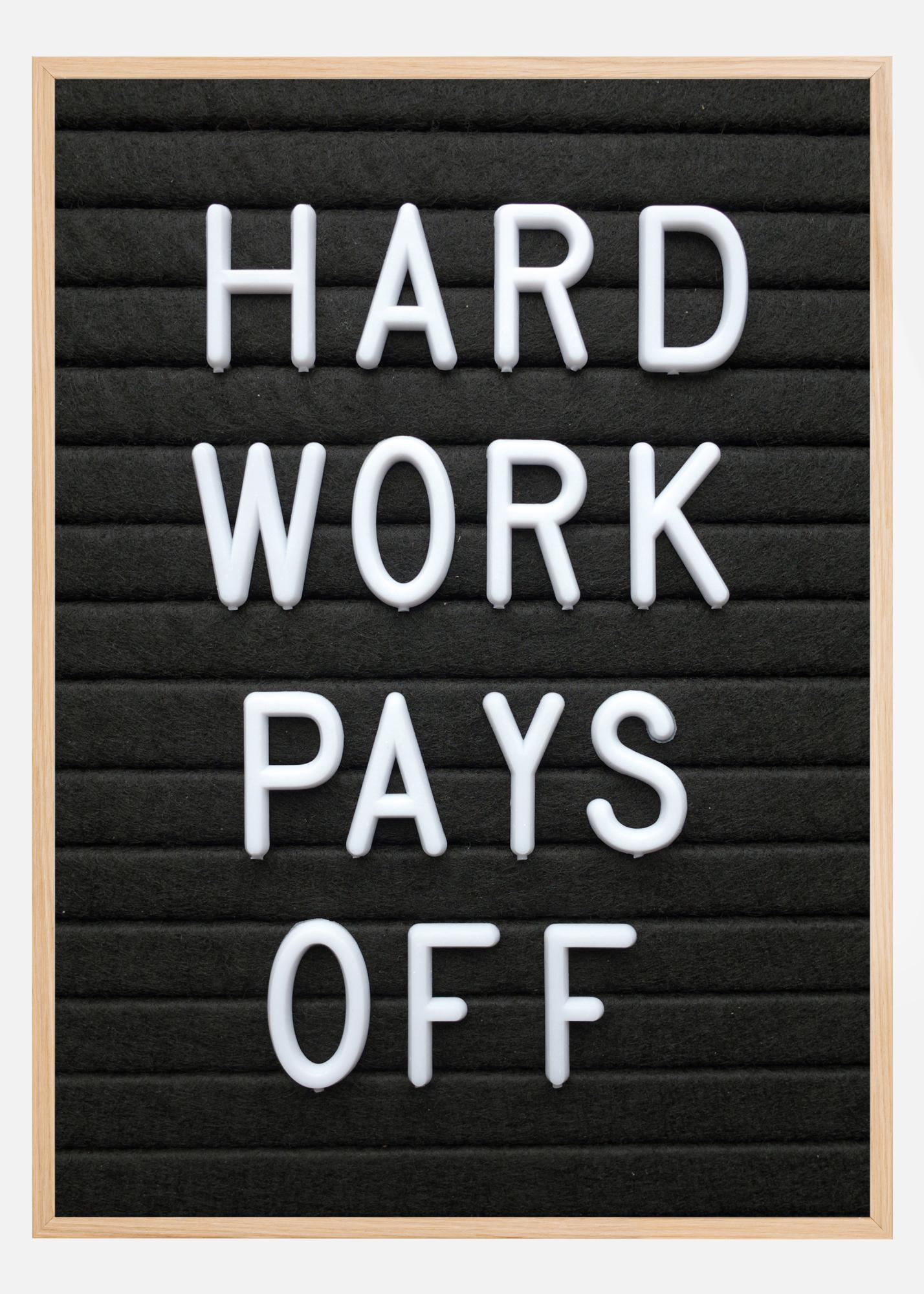 En enkel men effektfull poster med orden "Hårt arbete lönar sig". Vita stora bokstäver mot en svart bakgrund ger ett mycket starkt budskap till den som ser bilden. En perfekt poster att hänga på en vit vägg i en kontorsmiljö.