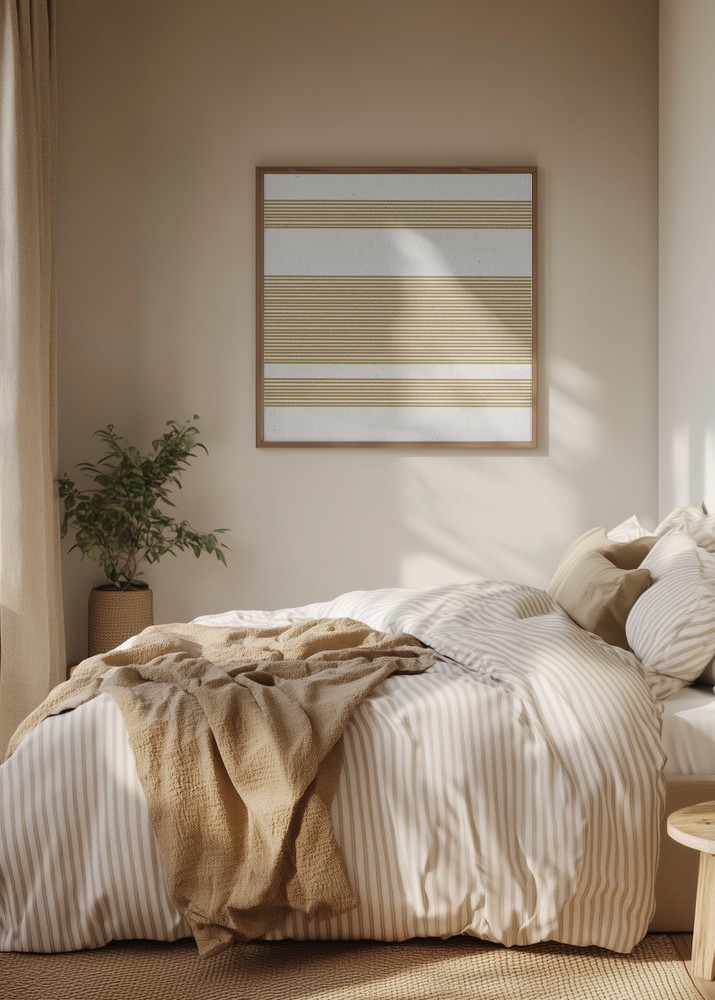 Färgerna på denna affisch utgörs av en varm, gyllene nyans som kontrasterar mjukt mot en krämvit bakgrund. Dessa färger kompletterar varandra och förstärker den sofistikerade känslan i detta print. Ett utmärkt val för dig som uppskattar subtil men elegant design i din inredning.