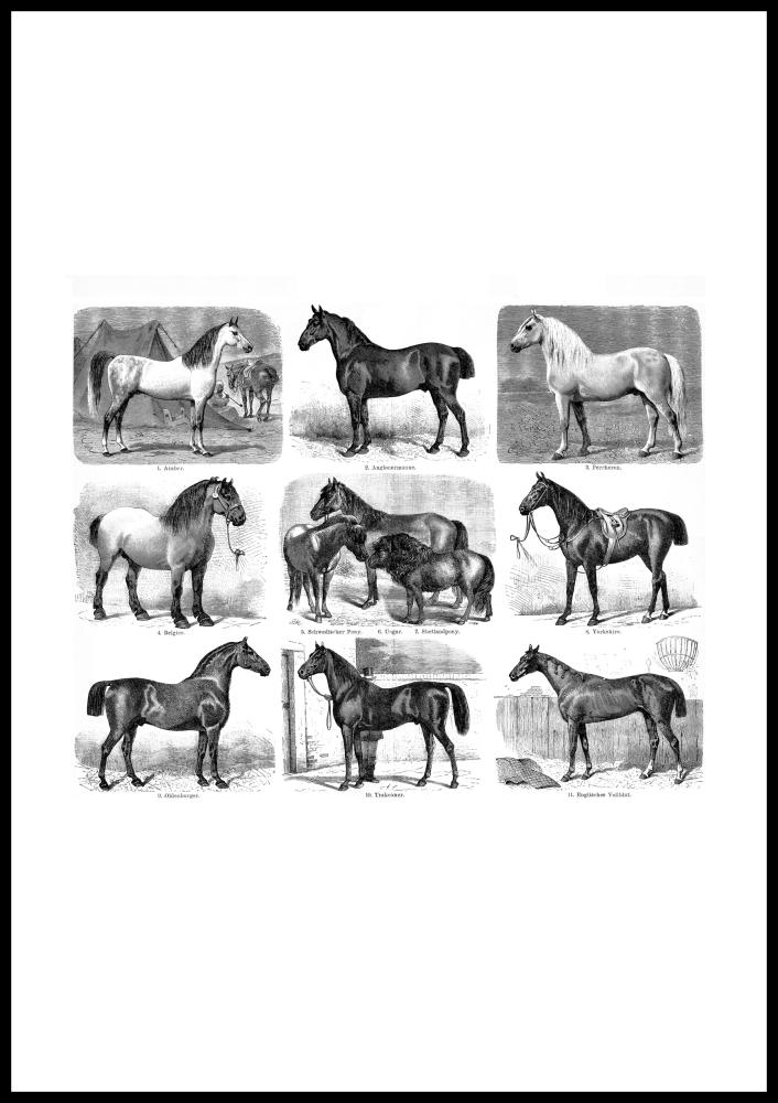 Kan du inte få nog av hästar har vi här en vacker affisch med ett motiv föreställande olika hästraser. Under varje bild finner du namnet på raserna skrivna på engelska. Eftersom affischen är svartvit är den enkel att kombinera med en ram i en fin färg. Affischen finns i flera olika storlekar som passar såväl att ställa på en byrå som att hänga på väggen.