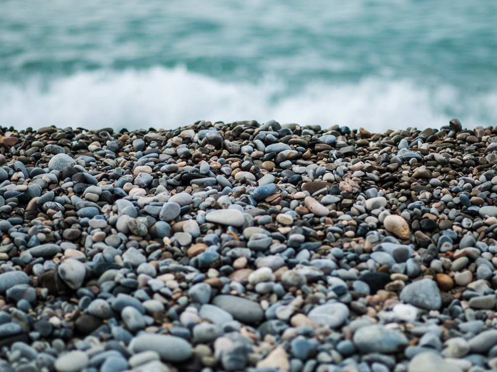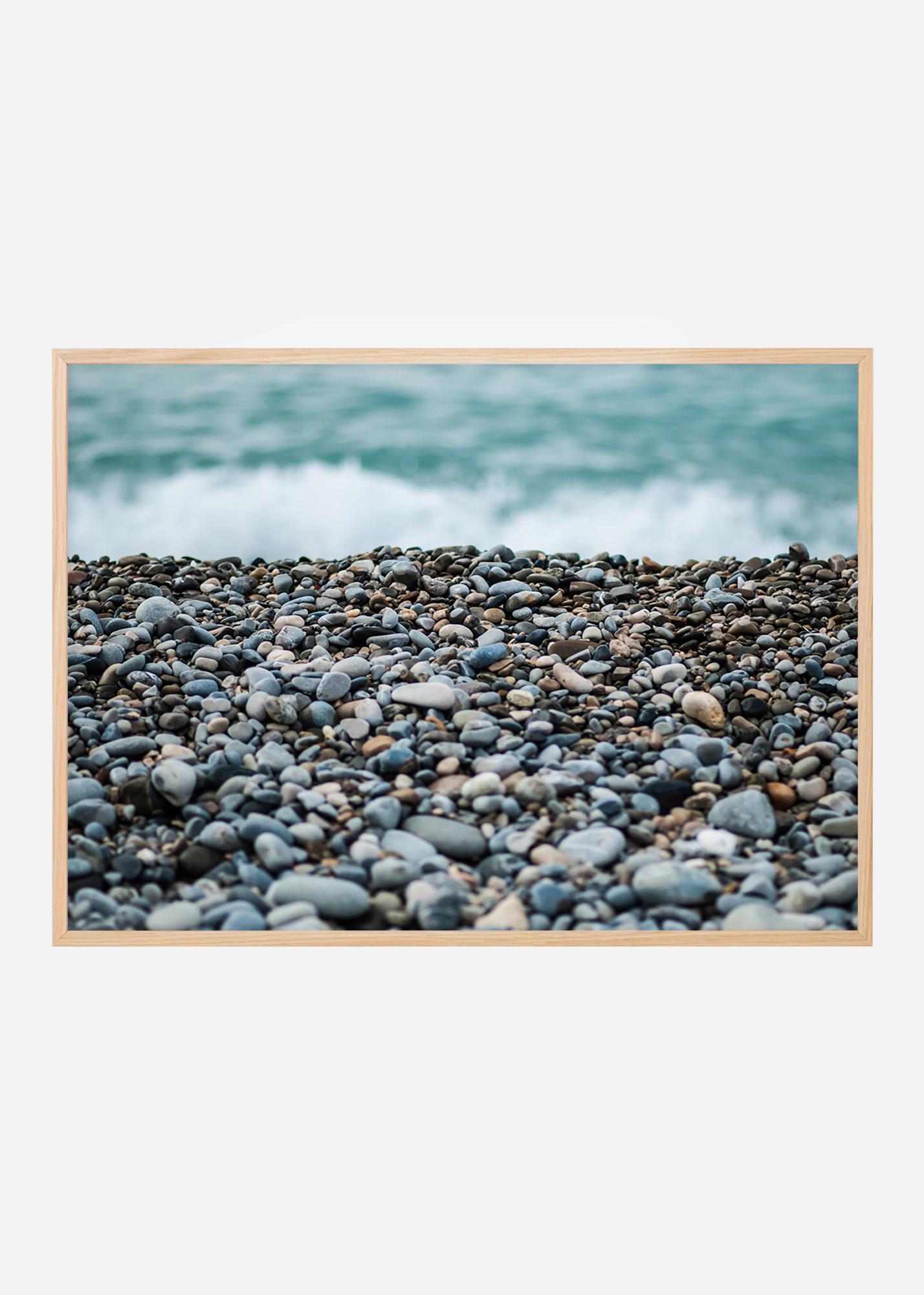 Hör havsvågornas brus från den här affischen med en vacker stenstrand i förgrunden. Det korta skärpedjupet ger en intressant bild som drar in ögonen i bilden.Hittar du någon rundslipad glasbit bland stenarna? Den gråblåa färgskalan gör sig bra med en smal ram mot en ljus vägg, gärna med marina accessoarer till.
