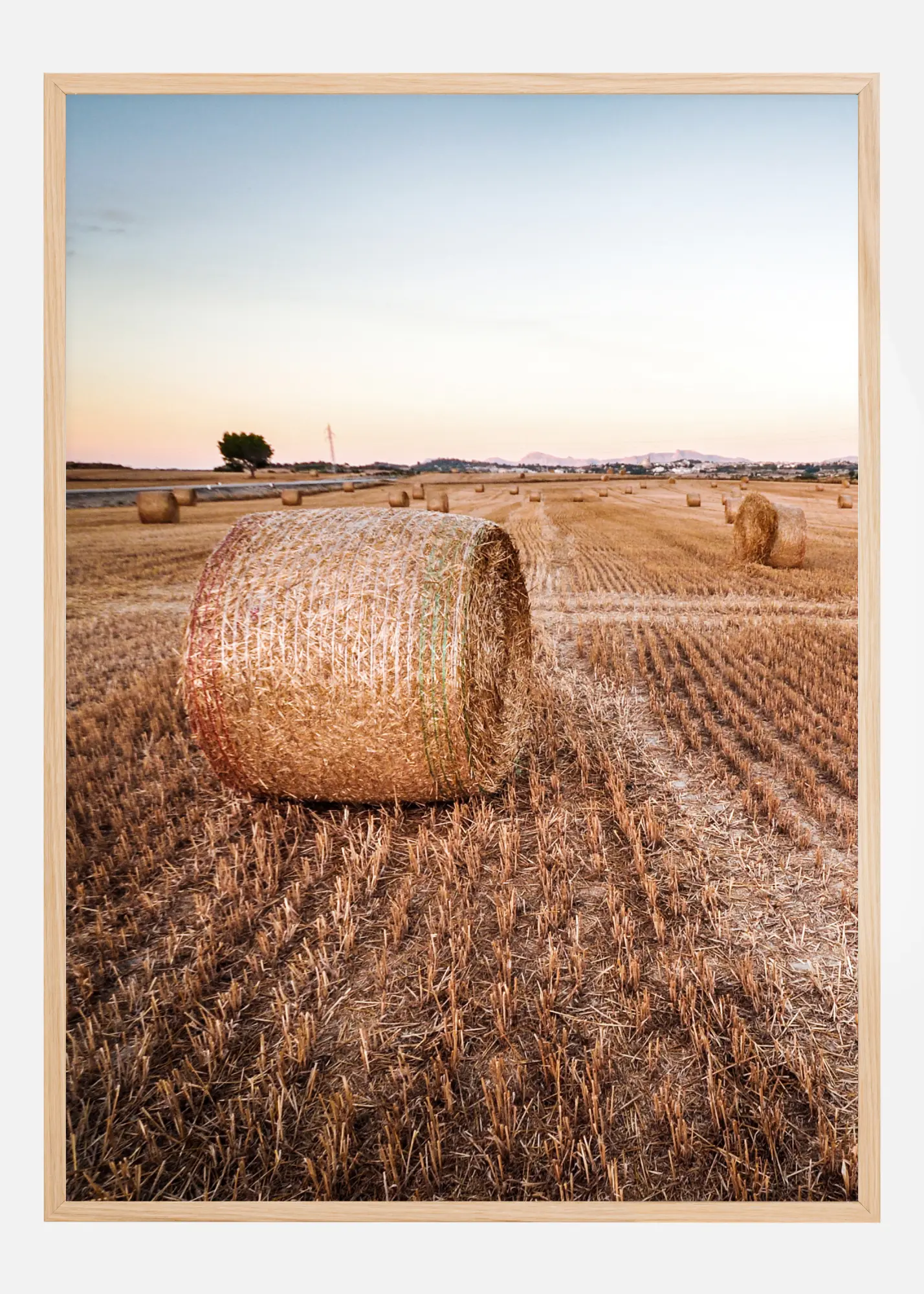 En enkel men vacker naturposter. Höstacken i förgrunden har rullats snyggt, medan det på avstånd finns andra rullade höstackar utspridda på fälten. En ljusblå himmel och de varma bruna färgerna skapar en varm och avkopplande bild som kan hängas upp i ett lantligt kök.
